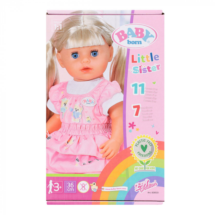 Особливості ляльки BABY born Молодша сестра 36 см: рухливі ручки і ніжки, її легко переодягати; п'є з "дорослої" спортивної пляшки; плаче справжніми слізками; закриває очі, якщо покласти лялечку на спинку; висота ляльки - 36 см; сприяє усебічному розвитку дитини.