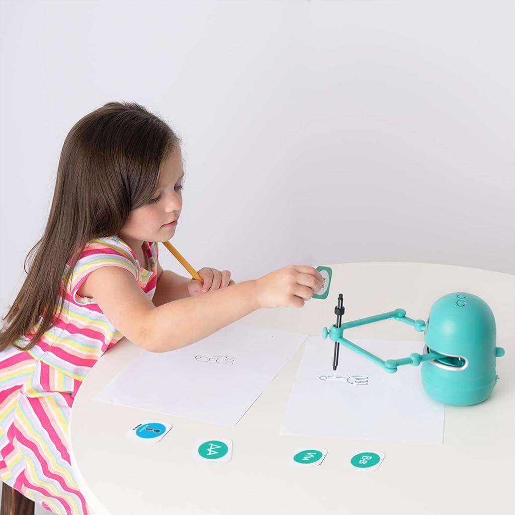 2. Квінсі вчить писати по літерах: після того, як робот з дитиною закінчить малювати якийсь предмет, Квінсі запропонує написати його назву. Далі дитині потрібно буде відібрати картки з буквами, з яких складається це слово. Проскануйте QR-код кожної букви слова - робот буде озвучувати їх по черзі і зрозуміє, вірну відповідь дала дитина чи ні. Таким чином, дитина зможе вивчити українську абетку разом з Квінсі.