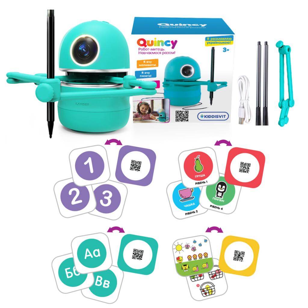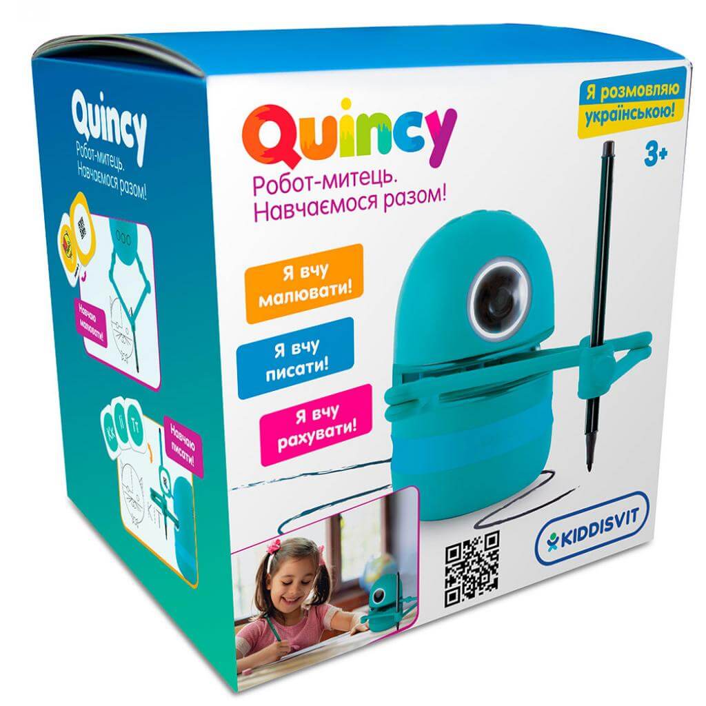 Quincy (Квінсі) - інтерактивний, портативний, електронний навчальний робот-митець, що розмовляє українською. Він не тільки стане першим вчителем Вашого малюка, але й справжнім другом. Крок за кроком робот навчатиме малюка малювати фрукти, тварин і різні предмети, писати слова по літерах, математики, розповідатиме цікаві історії, пояснюватиме всі свої дії українською мовою.