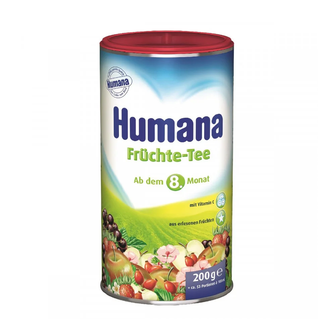 Фруктовий чай Humana (Хумана) - корисний напій з насиченим фруктовим ароматом і неповторним смаком, який забезпечує організм натуральними вітамінами і сприяє зміцненню імунітету. Рекомендується при гіповітамінозах, для профілактики і лікування ГРВІ, після хвороб і в зимово-весняний період. Відмінно вгамовує спрагу і покращує апетит. Не містить кристалічного цукру, глютену, лактозу. Має м'який жовчогінний ефект. В упаковці приблизно 50 порцій готового чаю. Для дітей старше 8 місяців.
