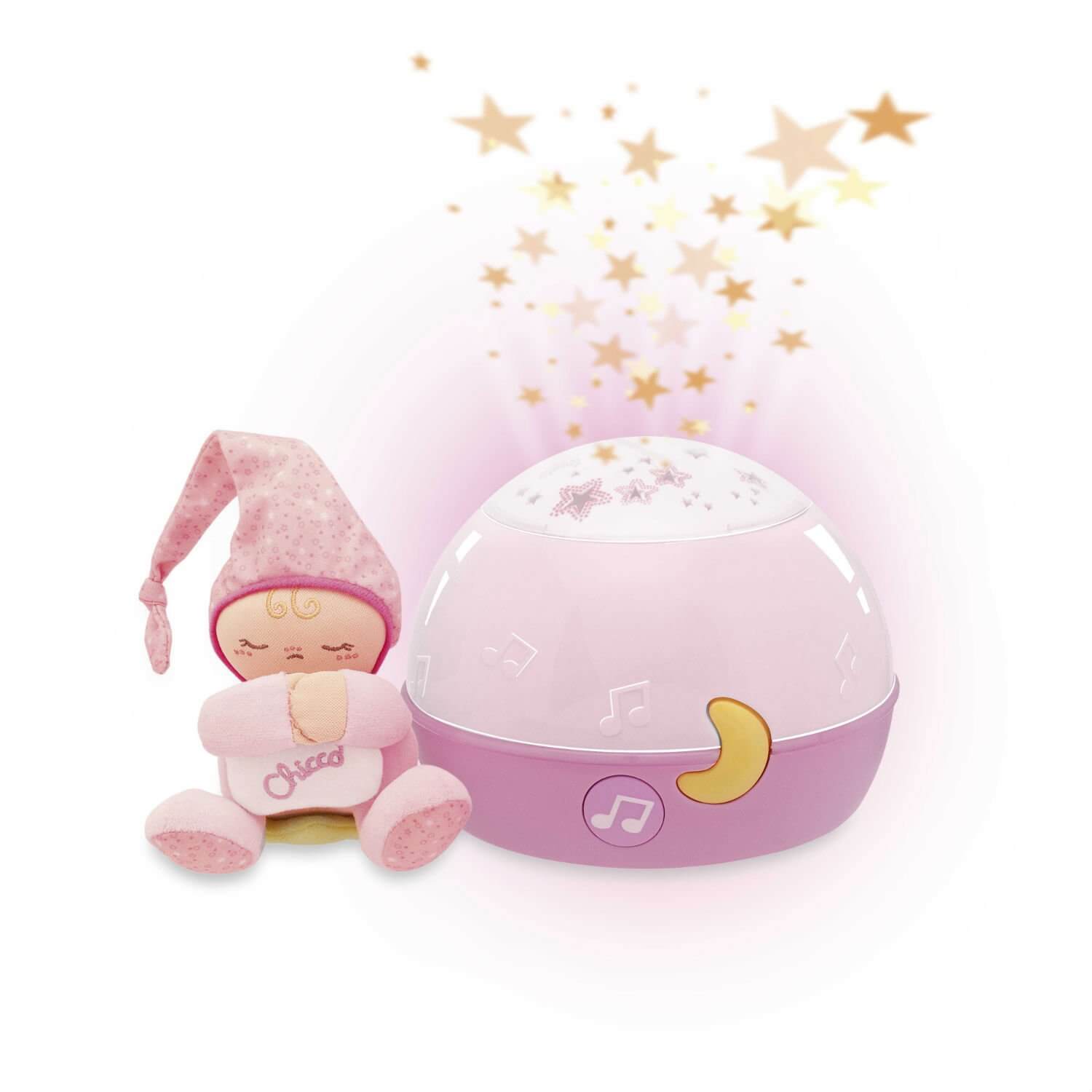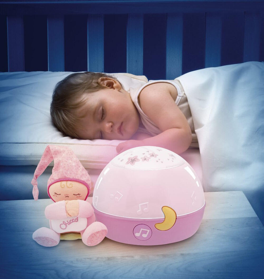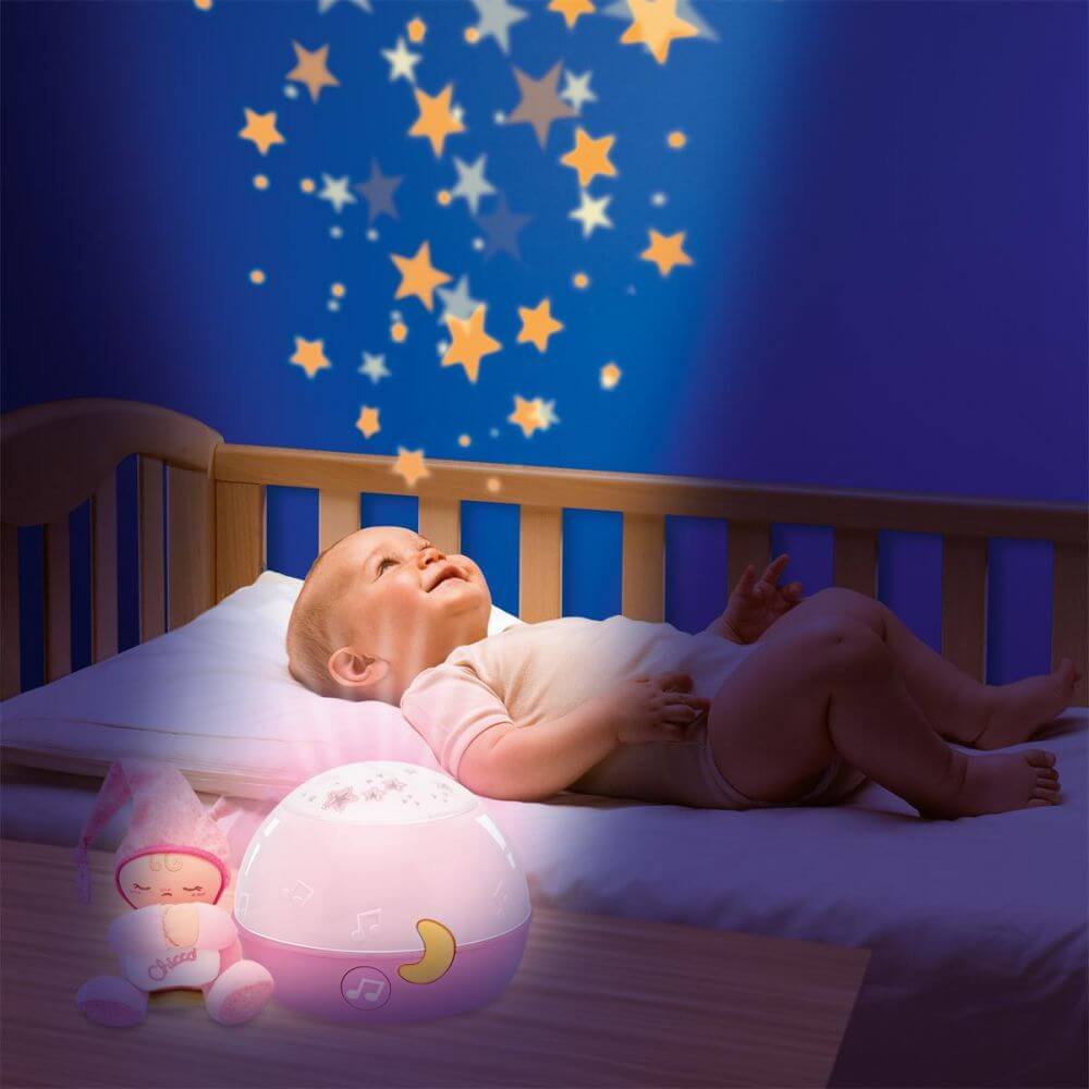 Музичний проектор із зірочками створить у кімнаті магічну атмосферу: чарівність проектованих зірок у супроводі м'яких мелодій, допоможуть заспокоїти перед сном Вашу крихітку. Мелодії Баха, Россіні і звуки природи забезпечать дитині перше знайомство зі світом музики. Також увімкнувши проекцію зірочок на стелю, проектор можна використовувати в якості нічної лампи з легким м'яким світлом. Плюшевий чоловічок знімається, що дозволить дитині погратися з ним.