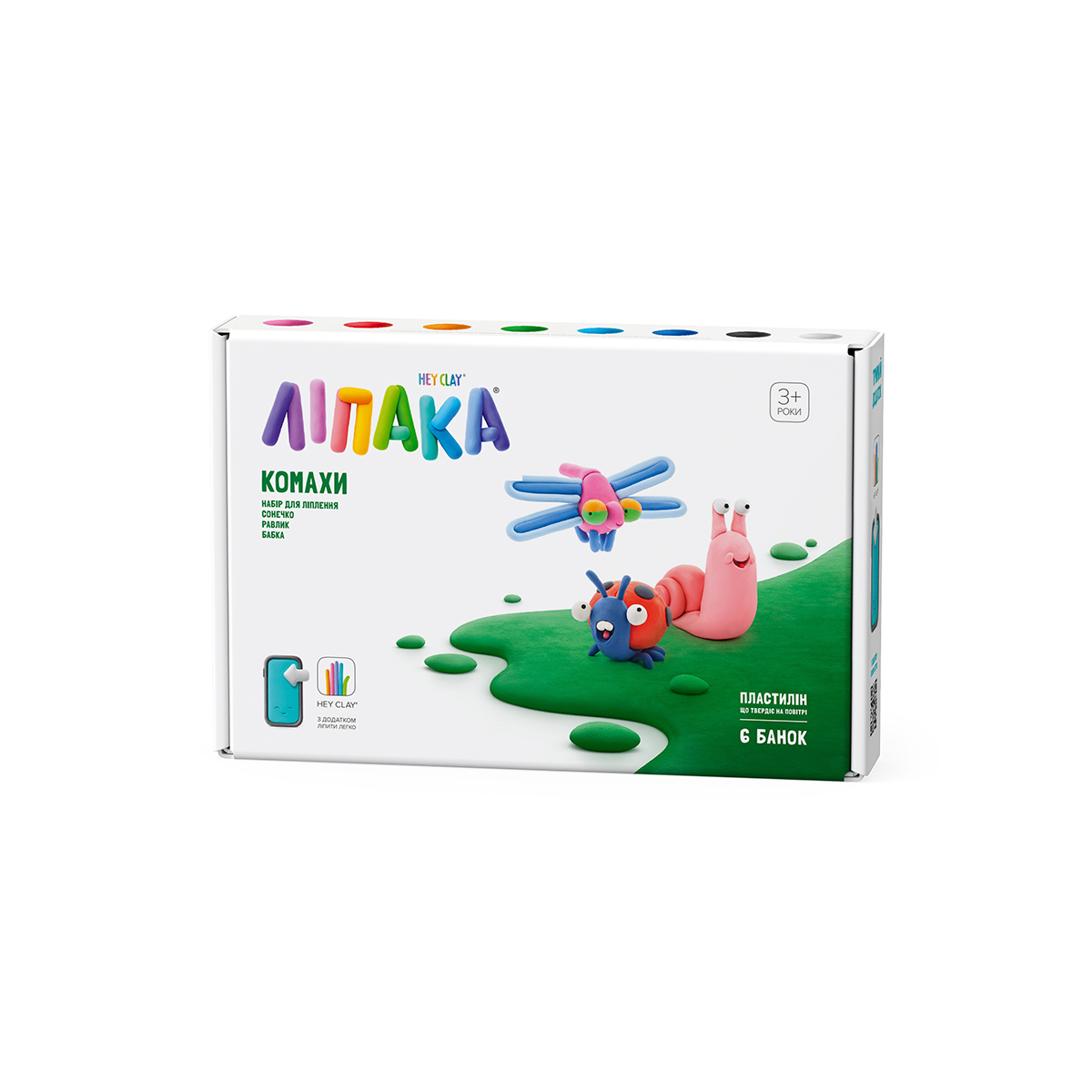 Набір пластиліну, що самостійно твердіє, ЛІПАКА –; СОНЕЧКО, РАВЛИК, БАБКА –; розважить і малюків, і дорослих. За допомогою анімаційних інструкцій в додатку HEY CLAY, Ви зможете зліпити трьох кумедних тваринок. Пластилін твердіє на повітрі протягом 24 годин, після чого можна гратися створеними фігурками.