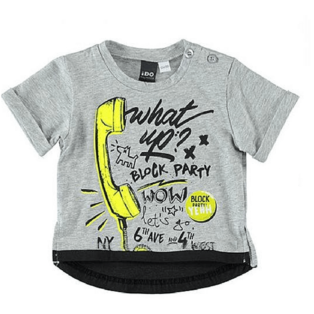Чудова хлопчача футболка на кожен день! Підходить для занять спортом або повсякденних літніх образів. Має круглу горловину, короткі рукава з вилогами, застібку на ґудзиках на плечі. Світло-сіру футболку прикрашає яскравий чорно-жовтий принт. По боках знизу є невеликі розрізи. У спинки подовжений закруглений низ. Склад: 93% бавовна, 7% віскоза.