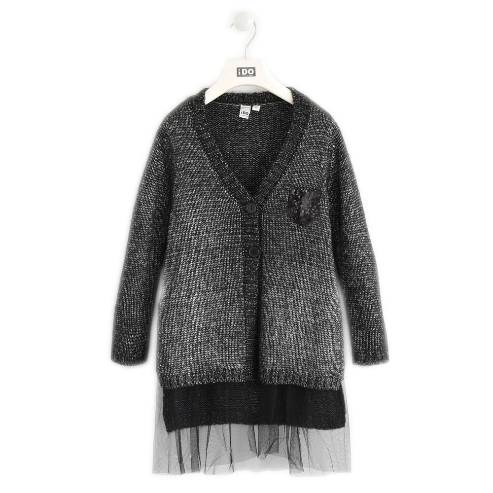Теплий в'язаний кардіган з трикутною горловиною та застібкою на ґудзики спереду. Пошитий з меланжевого сірого трикотажу. Має довгі рукава з манжетами-гумками. Спинка довша за перед, є невеликі розрізи по бокам. Зліва на грудях - кишеня з чорних паєток. Низ прикрашає чорна фатінова вставка. Склад: 71% нейлон, 29% акріл. Дитячий одяг бренду iDO - це висока європейська якість і кращі модні тренди.
