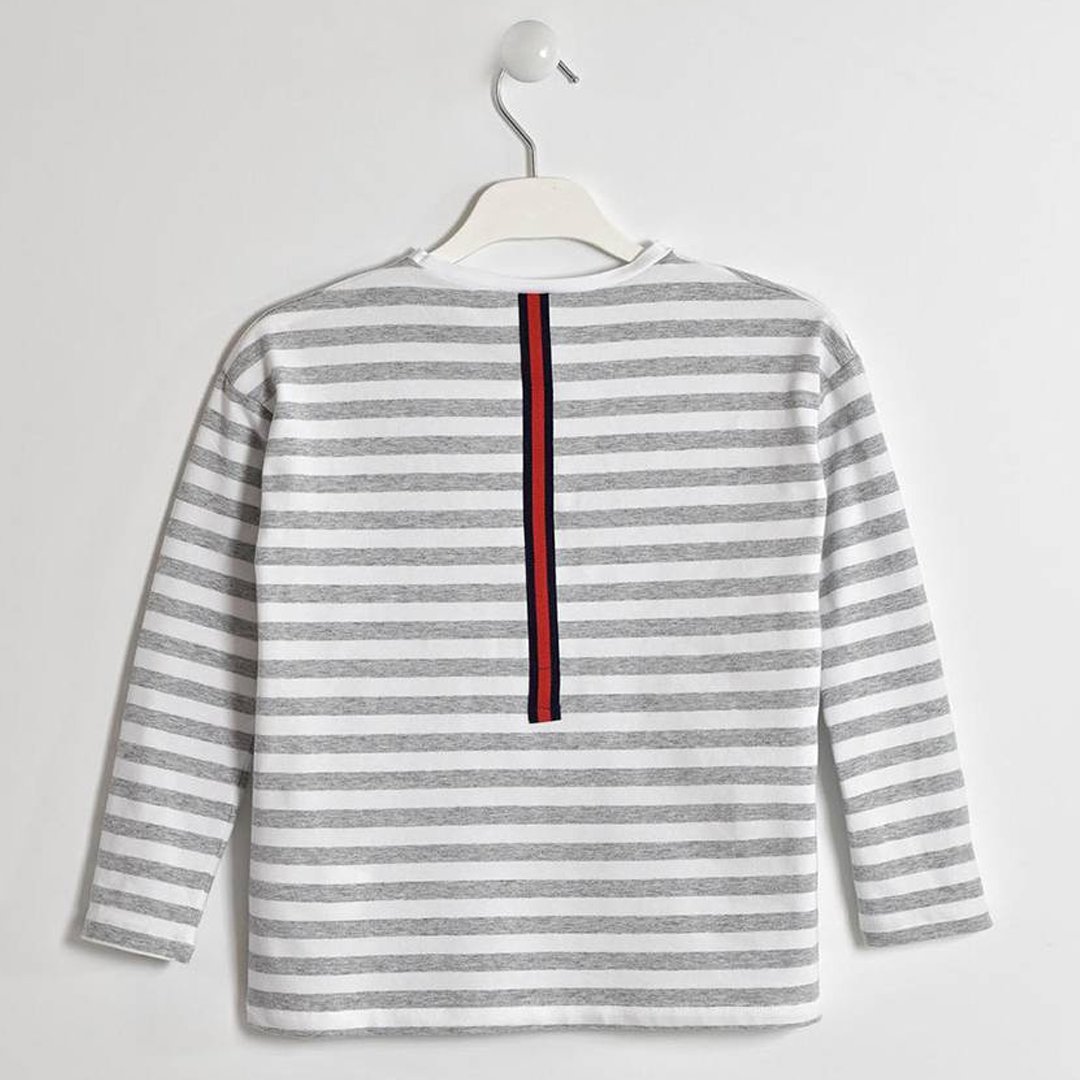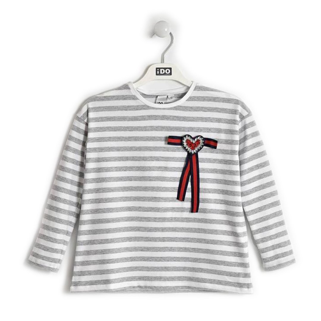 Гарний трикотажний реглан IDO з круглою горловиною виготовлений з еластичної бавовни в смугастий малюнок. Модель розкльошена до низу і спинка трохи довша за перед. Перед декорований аплікацією "серце" з паєток і стразів на бантику з кольорової стрічки. Кольорова стрічка також прикрашає спинку. Склад: 95% бавовна, 5% еластан. Колір: білий, сірий.