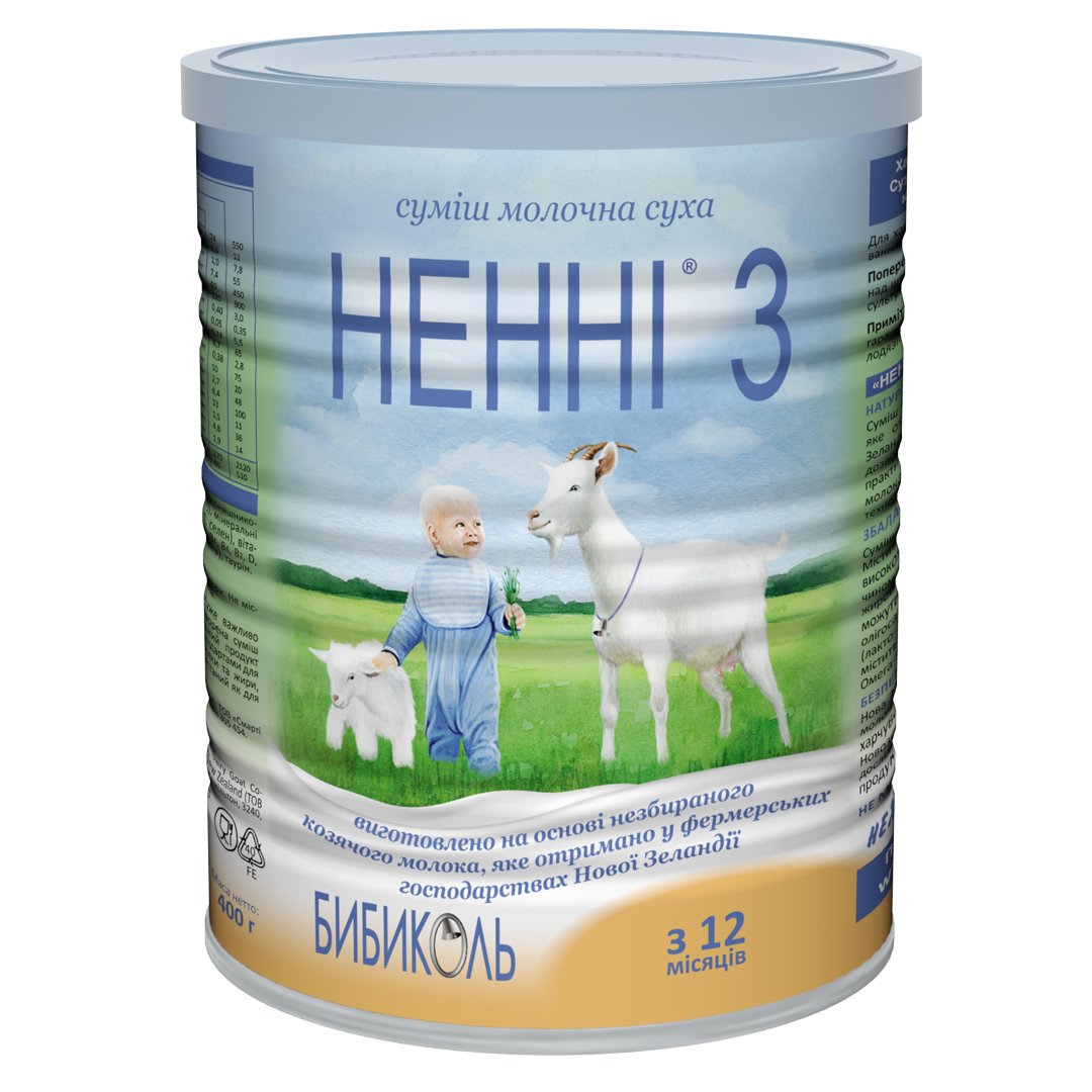НЕННІ® 3 з пребіотиками - сухий молочний напій на основі козячого молока, отриманого в фермерських господарствах Нової Зеландії. Продукт дитячого харчування для дітей старше року. Може бути використаний як для пиття, так і для приготування різних молочних страв. Містить повноцінні білки козячого молока з більш низькою кількістю альфа-S1-казеїну і бета-лактоглобуліну, натуральний молочний жир, високоякісні рослинні олії, залізо, кальцій. Головні переваги дитячих продуктів компанії "Бібіколь": доведена безпечність, натуральність, збалансований склад. Для розвитку дитини важливі нуклеотиди і олігосахариди, присутні в цілісному козячому молоці. Ці біологічно активні компоненти позитивно впливають на імунну систему. Суміш містить вітаміни, мінерали, жирні кислоти Омега-3 і Омега-6, що сприяють правильному розвитку органів зору і головного мозку. Окремі типи олігосахаридів стимулюють ріст і життєдіяльність корисної мікрофлори (лакто-і біфідобактерій) в кишечнику, покращують його роботу. Нова Зеландія - країна з дбайливо оберігаємою природою. Кліматичні умови дозволяють забезпечувати кіз свіжою травою увесь рік. Завдяки спеціальній технології виробництва дитячої суміші, властивості натурального козячого молока дбайливо збережені. Артикул 788876.