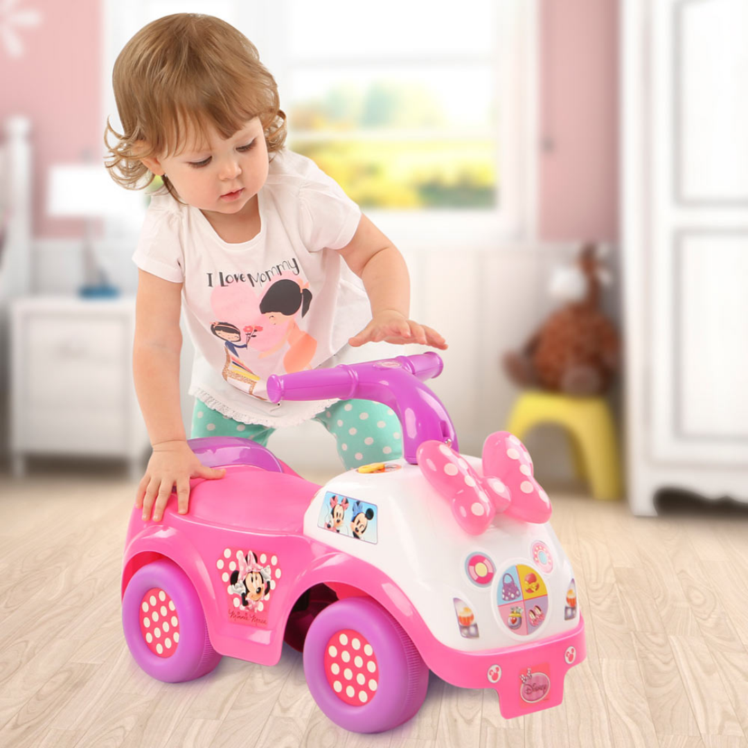 Маленьким водіям та водійкам потрібний транспорт. Цей дивомобіль сподобається жвавій малечі! Дизайн машинки ґрунтується на дитячому мультику про відому мишку Мінні Маус – зірку Disney. Толокар порадує дівчаток та хлопчиків звуками двигуна, веселими мелодіями і сигналами, миготінням "поворотників", а рожевий бантик на капоті запалюється яскравими вогниками. Можна обрати, до кого поїхати. На панелі управління є картки друзів: красуні-качечки Дейзі Дак, романтичної та милої мишки Мінні Маус, мишенятка-копії Мінні та грайливого, розумного песика Плуто. Натискання на кожне з цих зображень супроводжується власною мелодією. Іграшкова машинка виготовлена із якісного, безпечного пластику. У комплект входять 2 батарейки. Автівка за розміром 49 х 25 х 31 см. Машинки для дітей розвивають уяву, сприйняття простору, увагу, емоційну та музичну складові. Іграшка рекомендована дітям від 1-го року.
