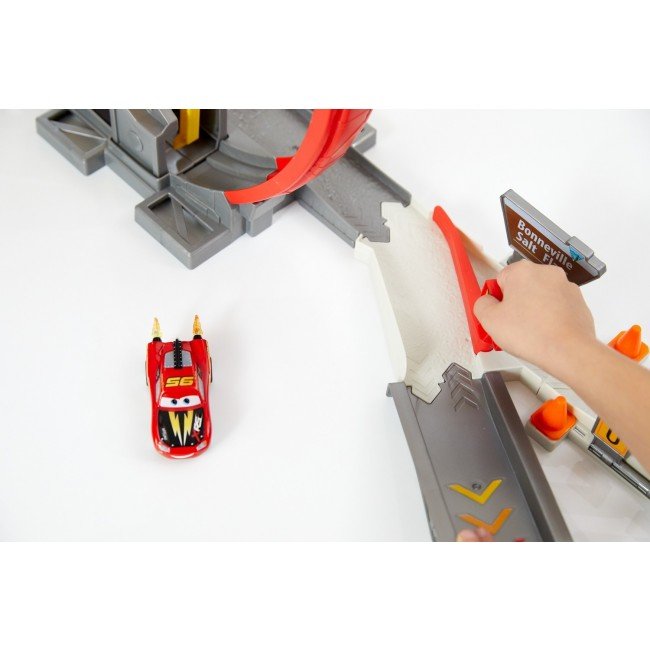 Продемонструй шалені трюки машинки-героя із мультфільму "Тачки" від Дісней-Піксар! Завантаж машинку на старт, підніми барʼєр та стартуй вниз по спуску. Трек оснащений петлею з прискорювачем, що надає машинці рекордної швидкості. Перевір на спідометрі, з якою швидкістю твій гонщик пройшов петлю. Далі жени по прямій або переключи направляючий пристрій, щоб заїхати на пандус і перелетіти через інші машинки! У наборі 1 машинка - Блискавка МакКвін.
