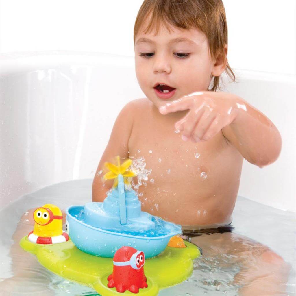 "Веселий фонтан" - це пірамідка та іграшка для ванної, що складається з 5 предметів: плавучої бази з насосом, 3 човників з вічками, 2 фігурок. Плавуча база на присосках легко кріпиться на дні ванної. Насос качає воду через центральну частину, створюючи чарівний фонтан. На базі розміщуватимуться човники, дві фігурки, кнопка з вічками для увімкнення й подавання води. Змінюючи фігурки та човники на верху, створюємо різні ефекти чарівного фонтану. Іграшка вчить розрізняти форми, розвиває світло- і кольоросприйняття, дрібну моторику, слухові навички, увагу, пам'ять, логічне мислення та творчу уяву.