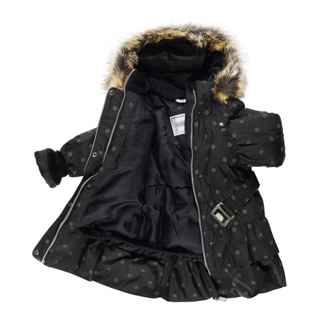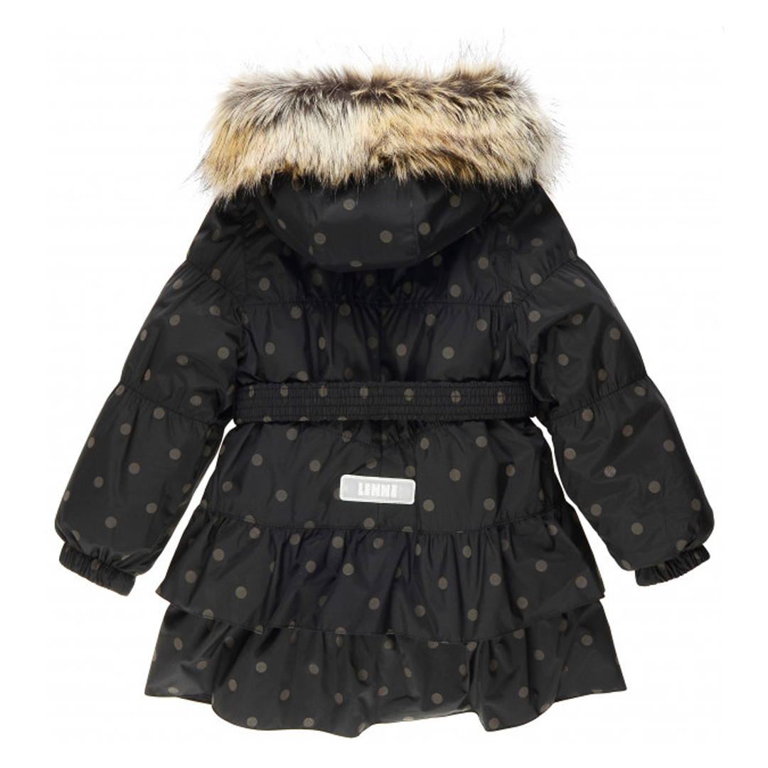 Стильне чорне пальто для модниці 6 років від естонського бренду Lenne. Виготовлене з дихаючої, зносостійкої, водонепроникної та брудовідштовхувальної тканини Active. Підкладка - 100% поліестер. Куртка утеплена IsoSoft (180 г/м2) - легким, гіпоалергенним та надзвичайно теплим синтетичним матеріалом. Розрахована на температурний режим від 0 до -20 градусів. Глибокий капюшон відстібається, прикрашений знімним штучним хутром. Талія підкреслена еластичним поясом із металевою пряжкою. Пальто застібається на блискавку, прикриту планкою на кнопках. Манжети рукавів стягнуті резинками.Низ куртки оброблений двома рюшами та має вигляд пишної спідниці. Принт - горошок.