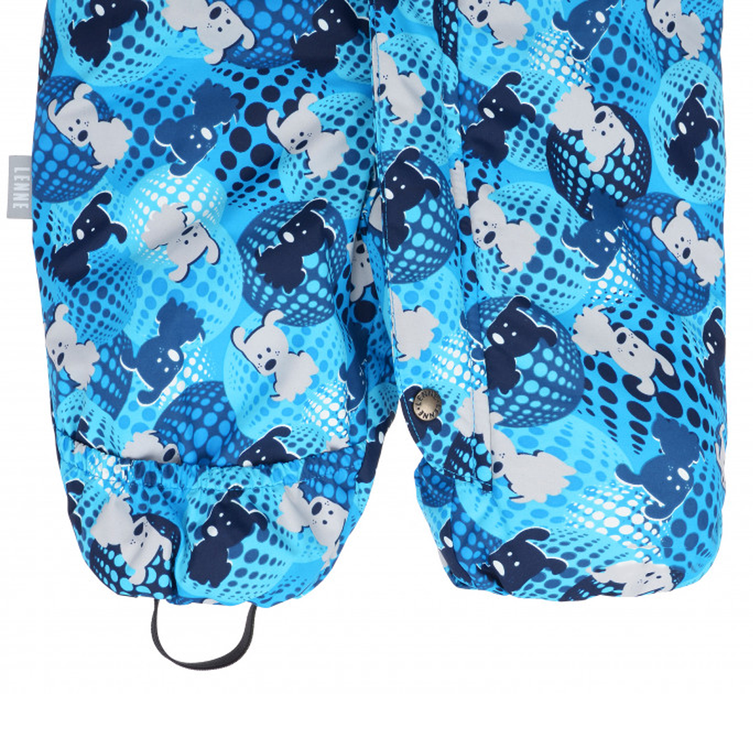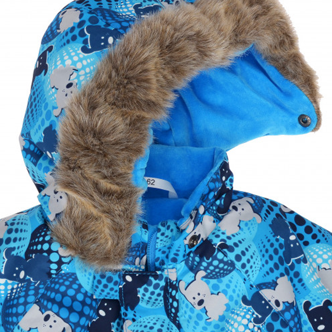 Суцільний теплий комбінезон для однорічних хлопчиків від відомого естонського бренду Lenne. Внутрішня частина коміру-стійки виготовлена з велюру. Утеплений капюшон відстібається. Підкладка - велюр. Сіре хутро на капюшоні пришите. Застібка-блискавка прикрита планкою. Манжети на рукавах стягнуті резинкою. Рукав закривається кишенькою. На штанинах теж є захисна кишенька.
