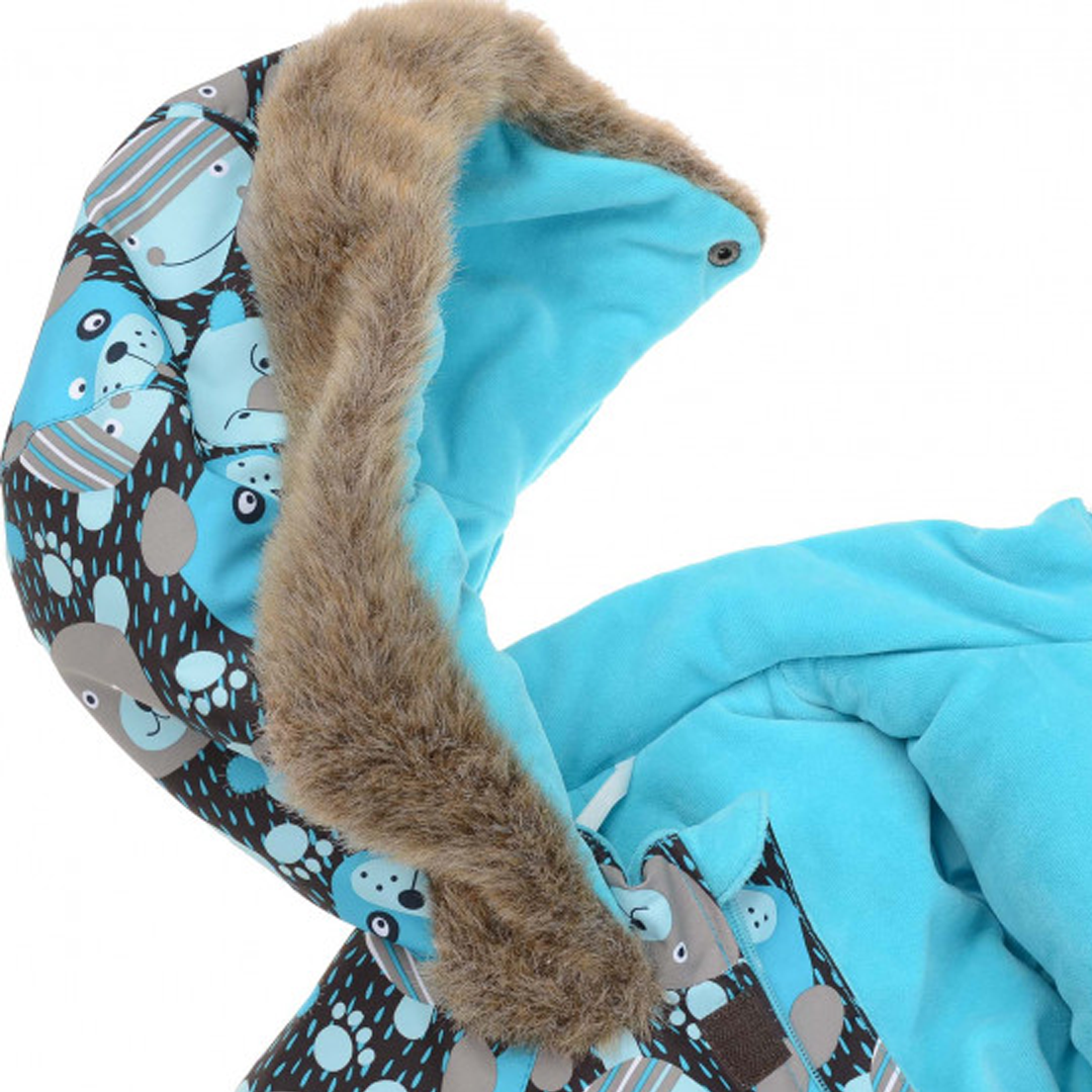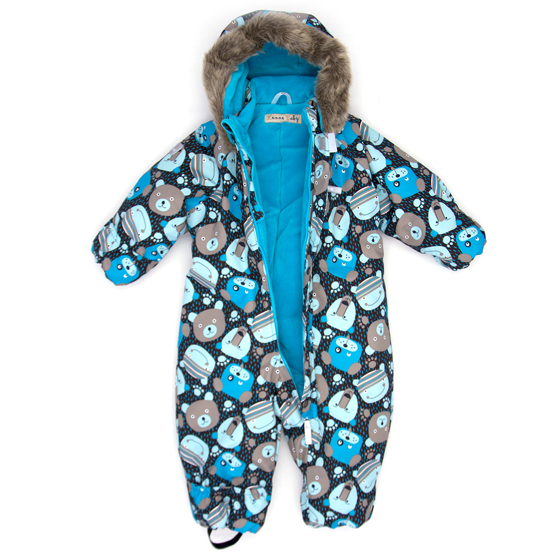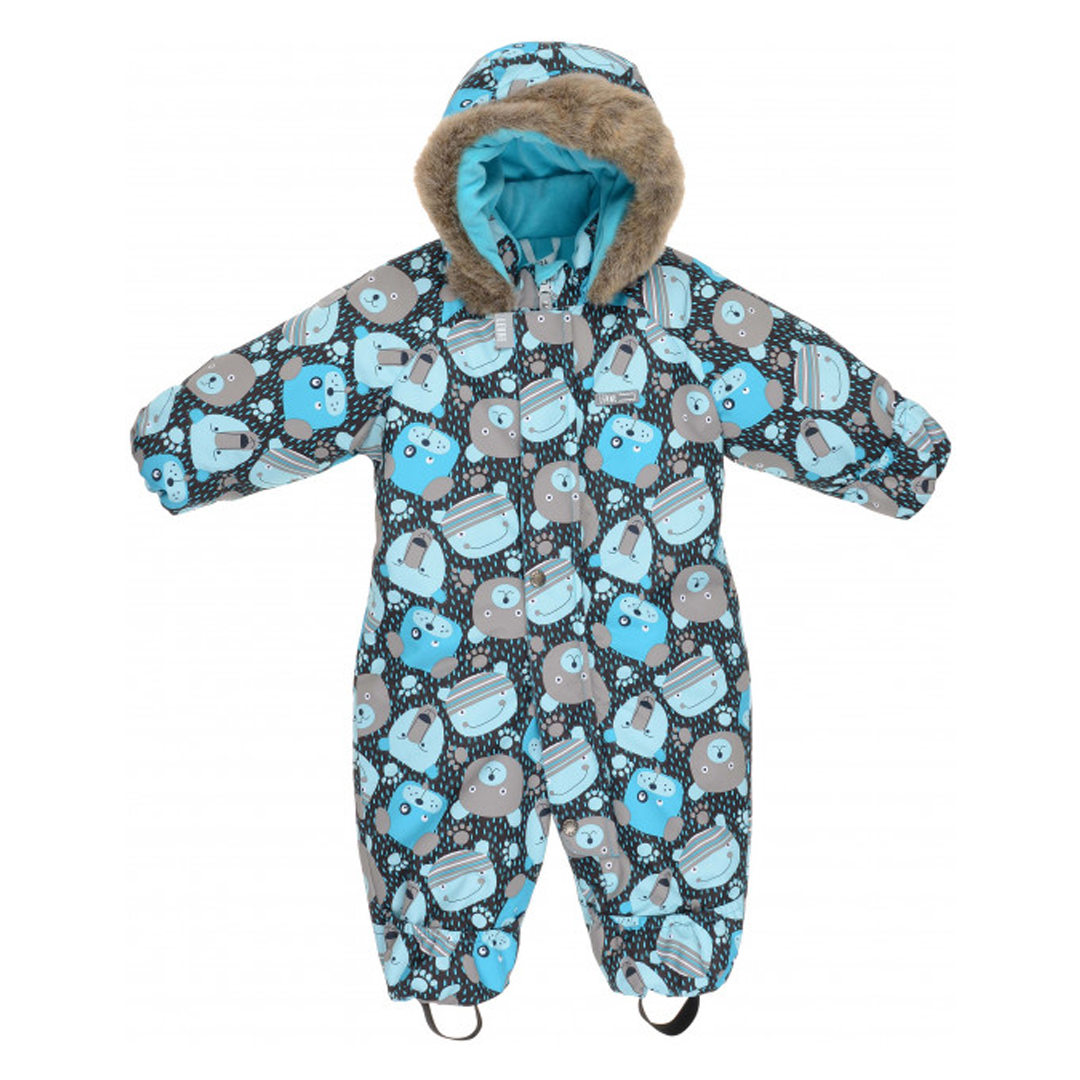 Комбінезон розрахований на температуру від 0 до -30 градусів, зріст 68 см. Колір - чорний з сірим, бірюзовим, блакитним. Принт - звірята. Артикул 373878.