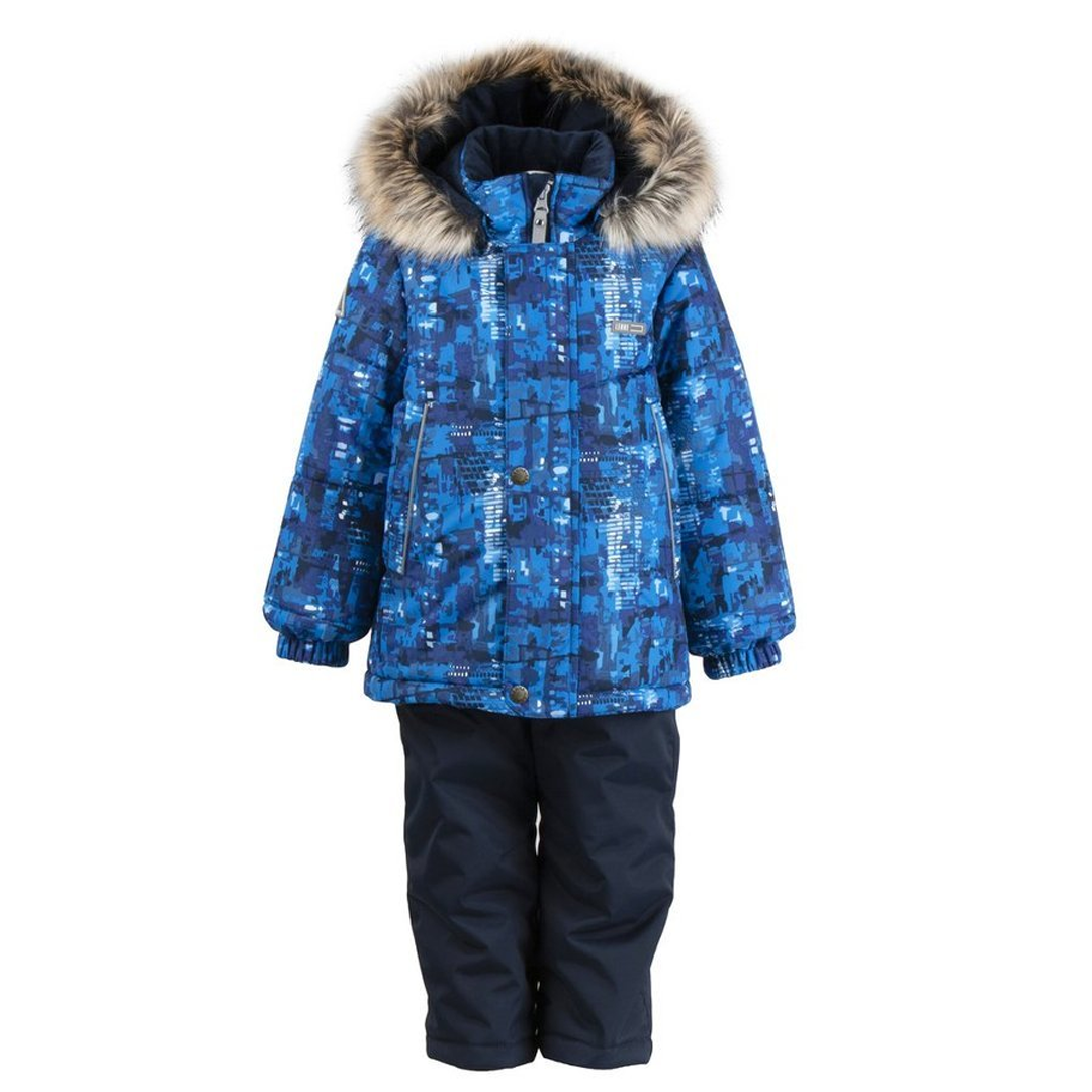 Куртка з принтом та темний однотонний напівкомбінезон для хлопчика 5 років від естонського виробника LENNE. Комплект розрахований на температурний режим до -30 С. Верх куртки - дихаюча, водонепроникна тканина Active, підкладка - 100% поліестер. Внутрішня частина коміру-стійки зроблена з велюру. Куртка має знімний капюшон з велюровою підкладкою, один шар утеплювача, штучне хутро. Застібається на блискавку, закриту вітрозахисної планкою з кнопками і липучкою. Манжет рукава та низ куртки стягнуті резинкою. В капюшоні, на комірі та в рукавах - м'яка флісова підкладка. Ширина і обсяг куртки регулюються еластичним шнурком. Напівкомбінезон виконаний з тканини ActivePlus Cordura 10 000 мм, що має підвищену зносостійкість, водонепроникність і брудовідштовхувальні властивості. Низ штанини прямий, всередині є снігозахист, регулюється штрипками. У напівкомбінезона регульовані підтяжки. Утеплювач - легкий та теплий IsoSoft: у куртці - 330 г, в напівкомбінезоні - 150 г. Є світловідбивачі. Колір - синій. Принт - абстракція.