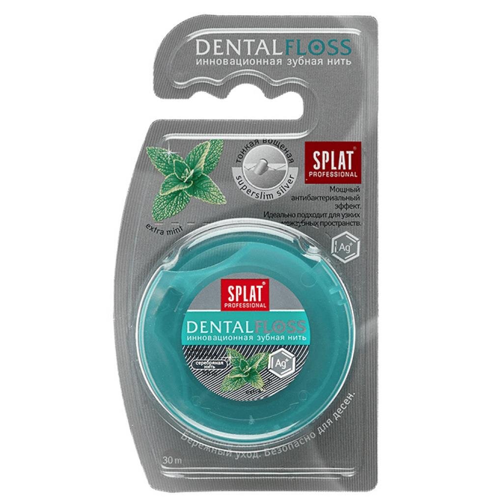 Супертонка антибактеріальна нитка "Сплат" для повноцінного догляду за порожниною рота. Проникаючи у важкодоступні місця, вона ретельно очищає бічні стінки зубів, міжзубні проміжки. Продукт містить срібні волокна, просочений антисептичним розчином "Біосол". Нитка не рветься й не пушиться під час гігієнічних процедур. Має приємний та освіжаючий м'ятний смак. Запобігає кровоточивості ясен, утворенню зубного нальоту та каменю. Довжини нитки - 30 метрів.