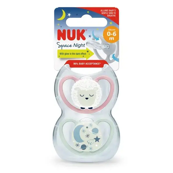 Пустышка ортодонтическая силиконовая NUK SPACE NIGHT р1, овца/звезды, 2 шт. (4008600401452)