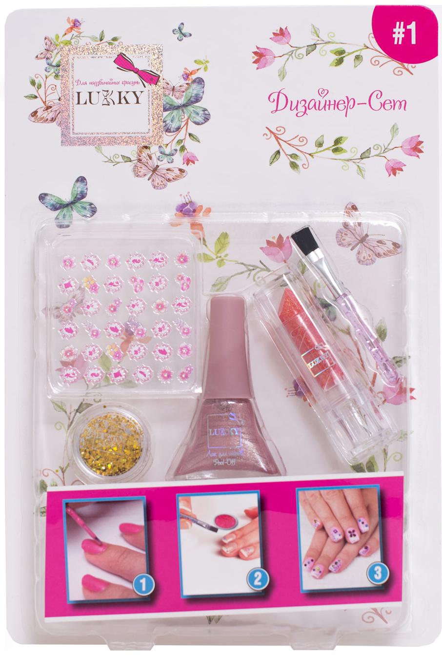 Дизайнер-Сет для ногтей и губ от Lukky. Набор включает в себя голубой лак для ногтей peel-off, стикеры для дизайна ногтей, розовые сухие блёстки для ногтей, кисточку для удаления излишков блёсток с ногтей и фиолетовую помаду для губ с блёстками.