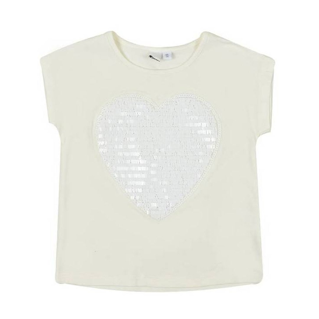 Милая девичья футболка из эластичного трикотажа - универсальная вещь на каждый день! Ее можно носить с юбкой, шортами или джинсами. Подходит для занятий спортом. Футболка имеет короткие рукава и круглую горловину. Перед декорирован большим сердцем - нежной аппликацией из блесток того же цвета, что и основная ткань. Состав: 90% хлопок, 10% эластан. Цвет: белый.