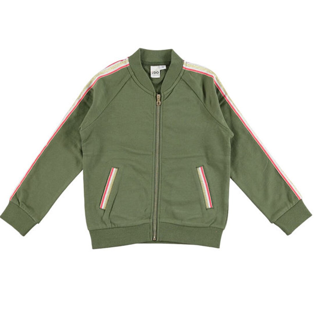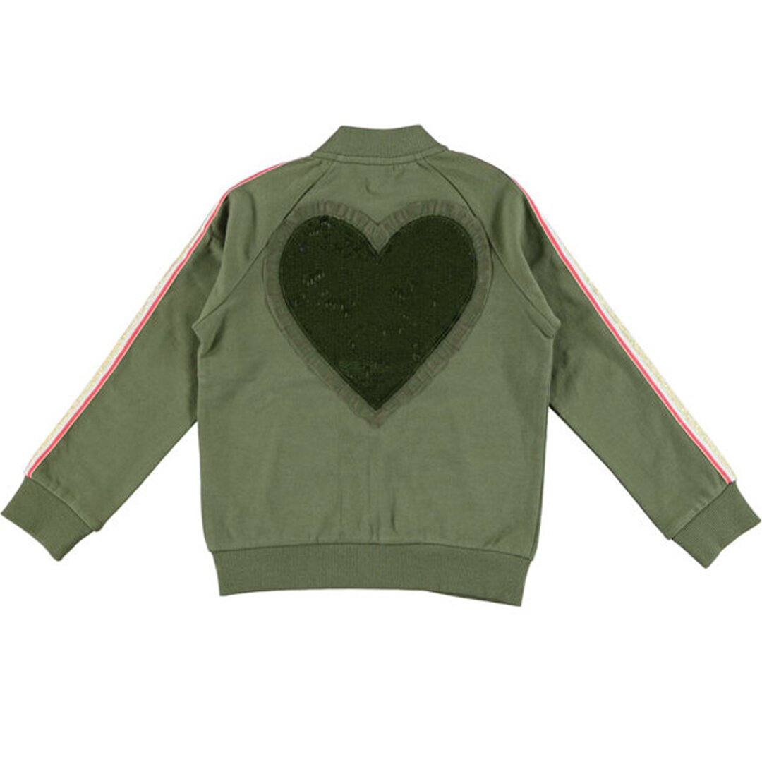 Модная кофта в стиле спорт-кэжуал для девочек 12 лет. Имеет капюшон и рукава-регланы. Застегивается на молнию. Декорирована красно-белыми лентами на рукавах и карманах, большим сердцем-аппликацией на спине. Украшена манжетами-резинками на горловине, рукавах, по низу. Состав: 95% хлопок, 5% эластан. Цвет: хаки.