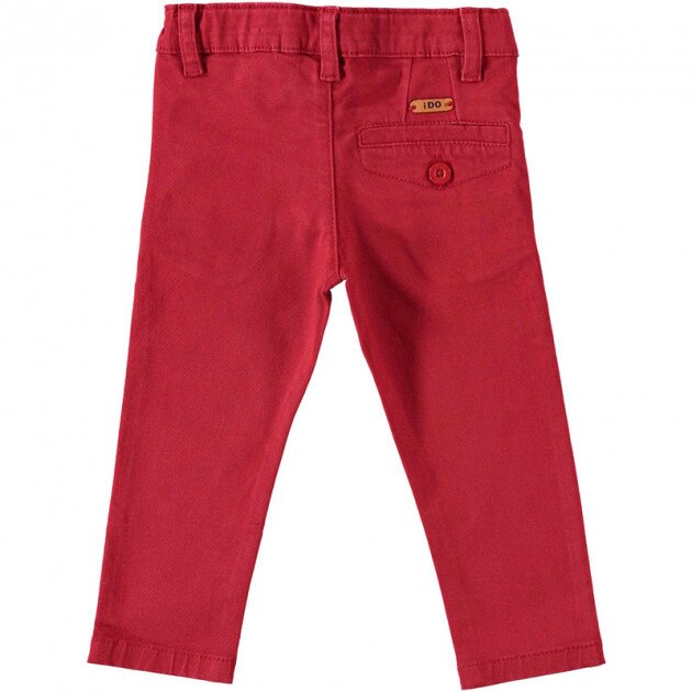 Зауженные брюки из эластичной хлопковой ткани. Спереди два боковых кармана. Сзади карманы в рамке с клапаном на пуговице. Талия регулируется резинкой с петлей и внутренними пуговицами, кулиской. Чиносы застегиваются спереди на молнию и металлическую пуговицу. Цвет - красный. Состав - 98% хлопок, 2% эластан. Детская одежда бренда iDO - это высокое европейское качество и лучшие модные тренды.