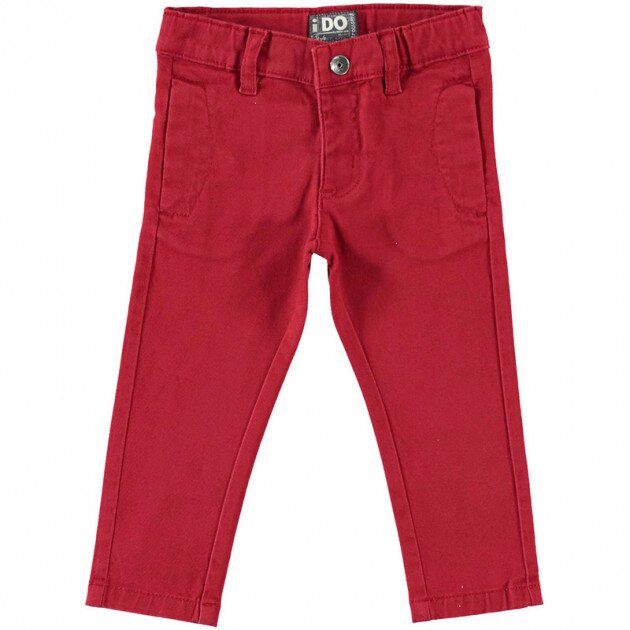 Зауженные брюки из эластичной хлопковой ткани. Спереди два боковых кармана. Сзади карманы в рамке с клапаном на пуговице. Талия регулируется резинкой с петлей и внутренними пуговицами, кулиской. Чиносы застегиваются спереди на молнию и металлическую пуговицу. Цвет - красный. Состав - 98% хлопок, 2% эластан. Детская одежда бренда iDO - это высокое европейское качество и лучшие модные тренды.