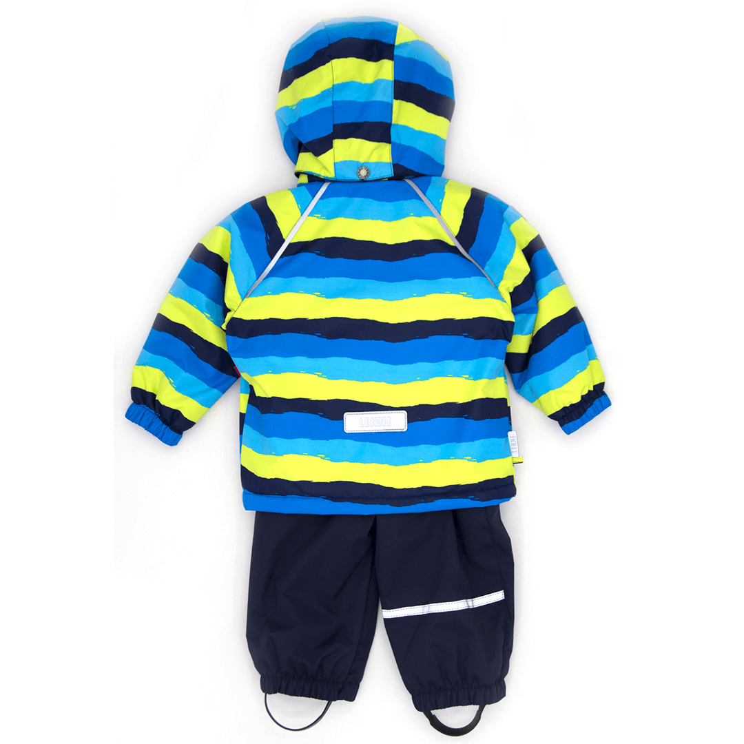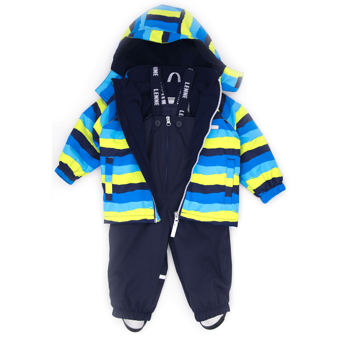 Яркий и практичный демисезонный комплект для шустрых непосед 1,5 лет. Рассчитан на температурный режим от +15 до 0 градусов. Утеплитель - IsoSoft 45 г/м². Есть светоотражатели. Состоит из куртки в голубые и желтые полоски, однотонного темного полукомбинезона на регулируемых лямках. Воротник верха - стойка, внутренняя часть - велюр. Капюшон отстегивается, утеплен одним слоем, подкладка - велюр. Манжеты рукавов и низ куртки стянуты резинкой. У куртки 2 вшитых кармана. Низ полукомбинезона стянут резинкой, регулируется штрипками. Есть застежка-молния.