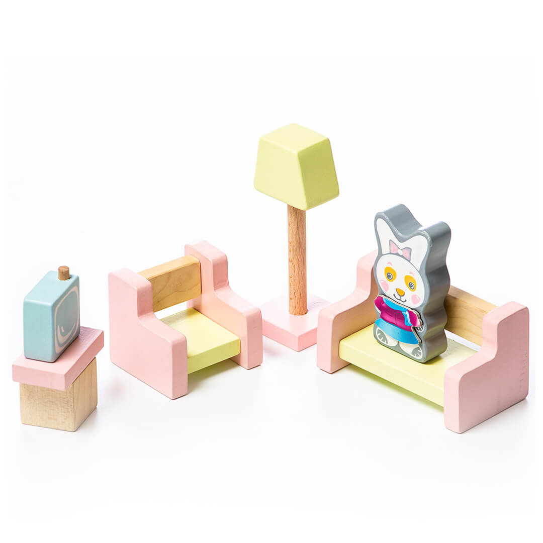 Экологичная развивающая игрушка от "Кубика" для первых сюжетно-ролевых игр. Изготовлена из безопасного, прочного, натурального материала - древесины. Покрыта красками на водной основе. В игровой набор входят предметы интерьера гостиной (диван, лампа, кресло, телевизор, тумбочка), магнитная фигурка зайчика высотой 8 см, сменная одежда на магнитах. Отличный подарок для девочек от 2 лет. Развивает мелкую моторику, пространственное мышление и социальные навыки.