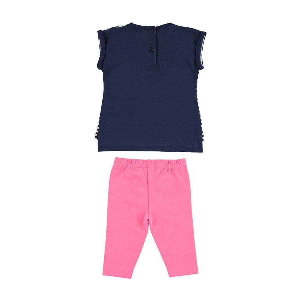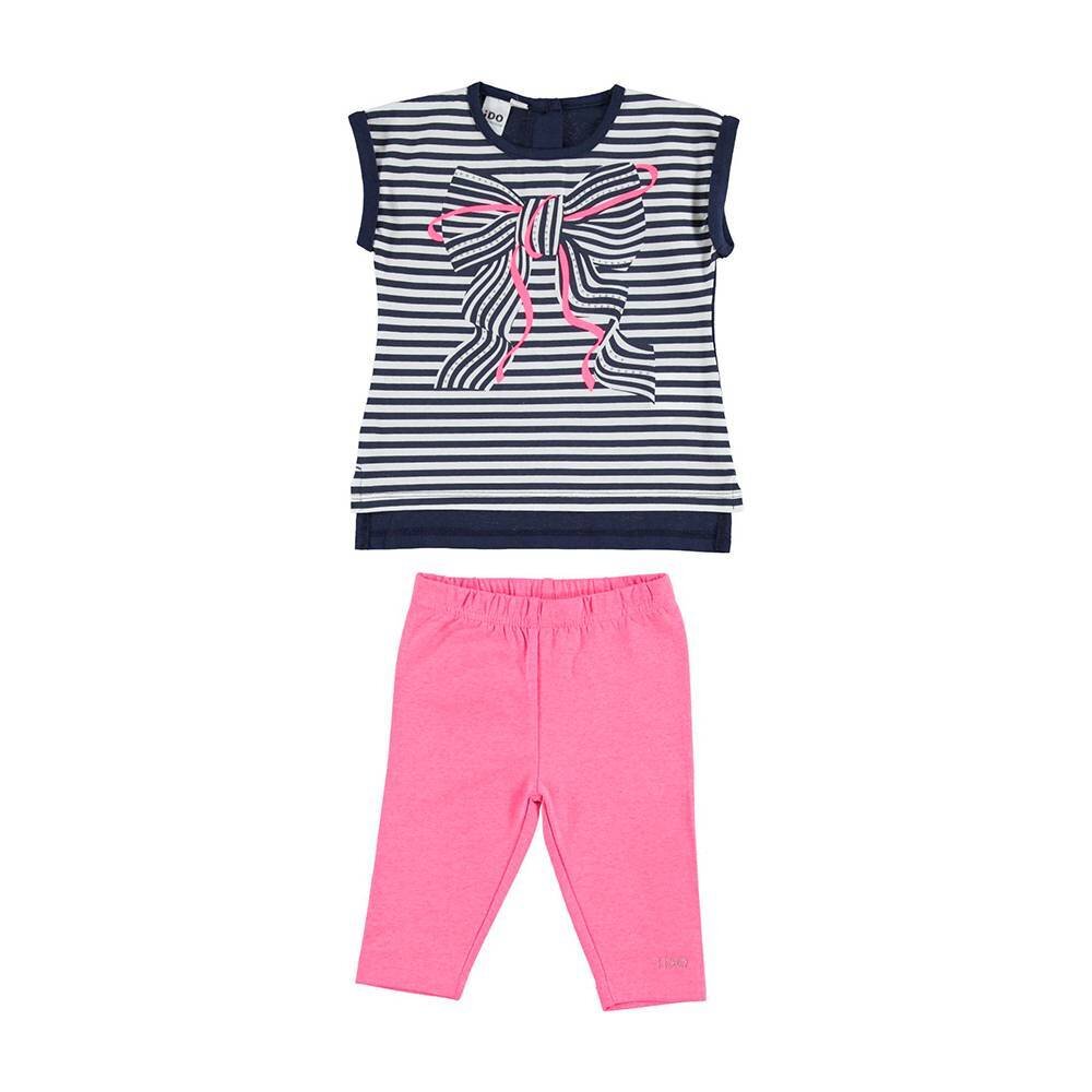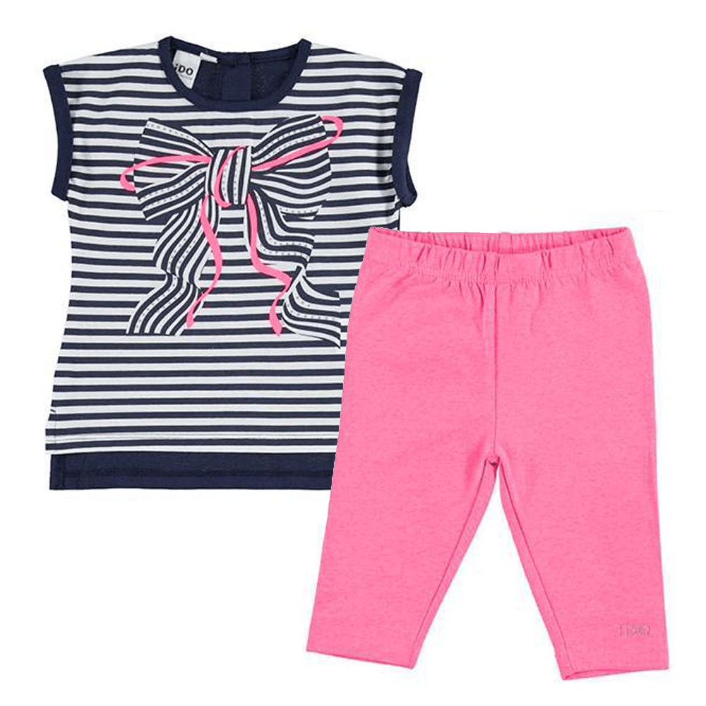• Летний комплект для девочки, состоящий из футболки и леггинсов. Состав: 100% хлопок. Облегающие шорты на резинке из розового трикотажа, длиной ниже колена. Темно-синяя футболка с удлиненными плечами и отворотами, круглой горловиной, застежкой на пуговицы на спинке. Украшена полосатым рисунком и большим бантом на груди. Детская одежда бренда iDO - это высокое европейское качество и лучшие модные тренды.