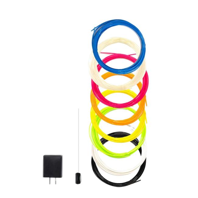 В набор входит: 8 стержней из PLA-пластика; 3D-ручка 3Doodler Flow; зарядное устройство; шомпол (стержень для чистки канала); инструкция; руководство по трафаретам.