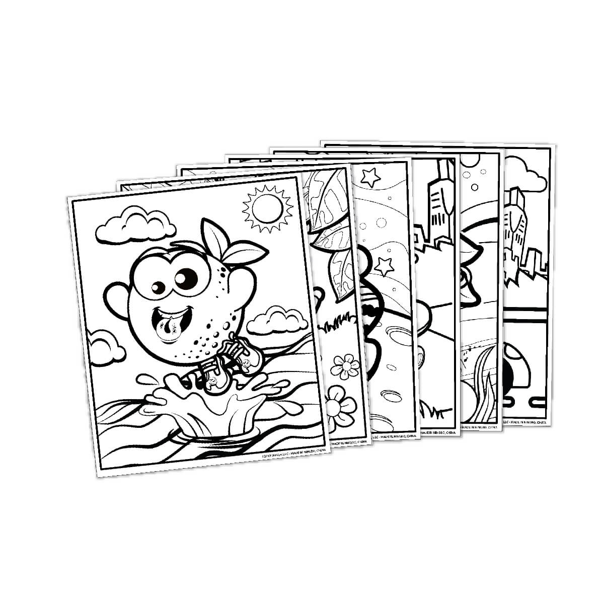 В набор Фруктомания входит: 5 карандашей, 5 маркеров, 5 гелевых ручек, 4 листа с наклейками, разрисовка.