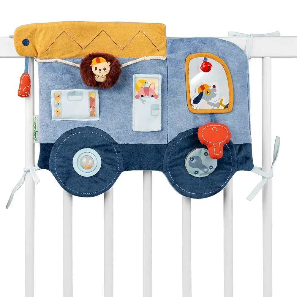 Этот тканевый панель активностей имеет 6 различных занятий. На передней части грузовика наш мастер-собачка изображена на зеркале, чтобы малыш мог себя увидеть, а также есть красный колокольчик, который можно потрясти. Необходимая деталь для начала - красный ключ, который издает звук при нажатии: вперед! На двух колесах грузовика есть погремушка с шариками, которую можно крутить, а также клапан, который можно поднять, чтобы обнаружить сюрпризы. Но будьте осторожны с ухабами, ведь Леон, ежик, может съехать с грузовика во время поездки на стройку! Как вы уже догадались, эта игрушка для развития на тему мастерства, ведь это одно из любимых дел нашего Жуля... И, возможно, скоро это станет любимым занятием вашего малыша!