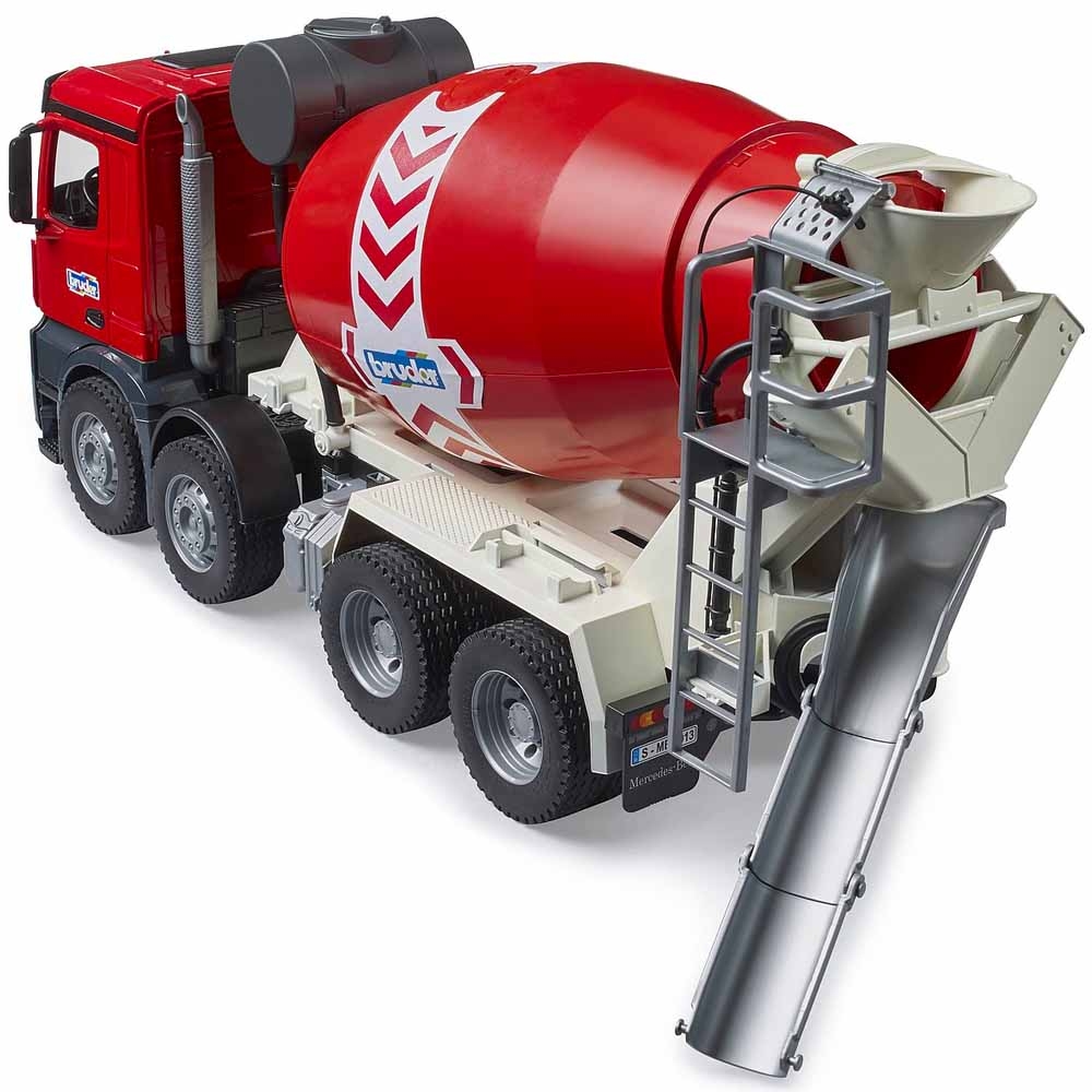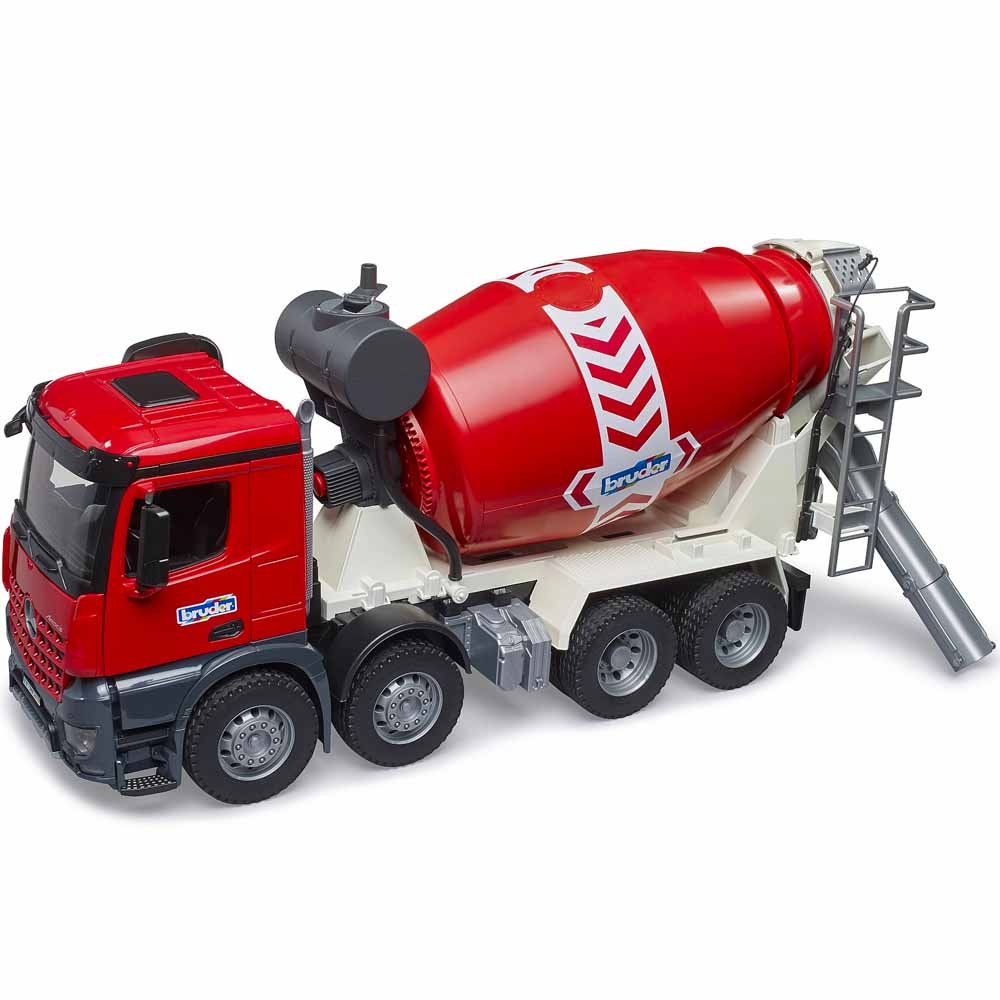 Бетономешалка Bruder Mercedes-Benz Arocs, красная (03655) выполнена в дизайне как настоящая бетономешалка Mercedes Arocs только в уменьшенном до 1:16 масштабе. Она ярко-красного цвета, с великолепной детализацией кузова как у Arocs, с 4 парами колес и функциональными элементами.