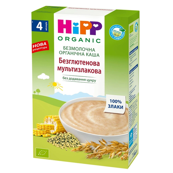 Безмолочная органическая каша HiPP Мультизлаковая - состав: органическая кукурузная мука 59%, органическая цельнозерновая овсяная мука 22%, органическая гречневая мука 19%, витамин B1. Не содержит глютена.