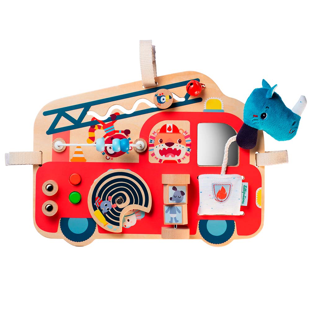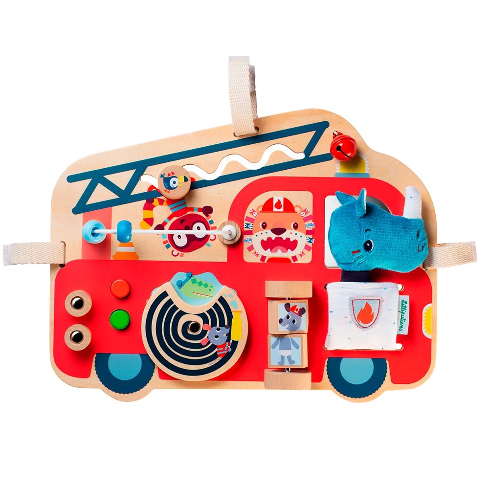 Бизиборд Lilliputiens Пожарная машина (83180) - идеальный развивающий бизиборд. Благодаря специальным креплениям его удобно брать в дорогу, крепить к коляске или просто играть с ним дома. Начнём наше путешествие? Садите носорога Мариуса в пожарную машину и поехали.