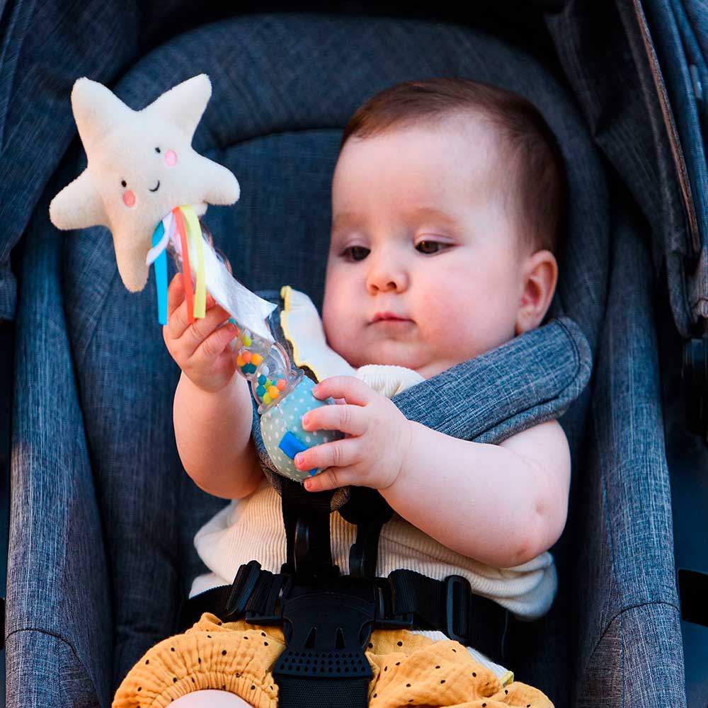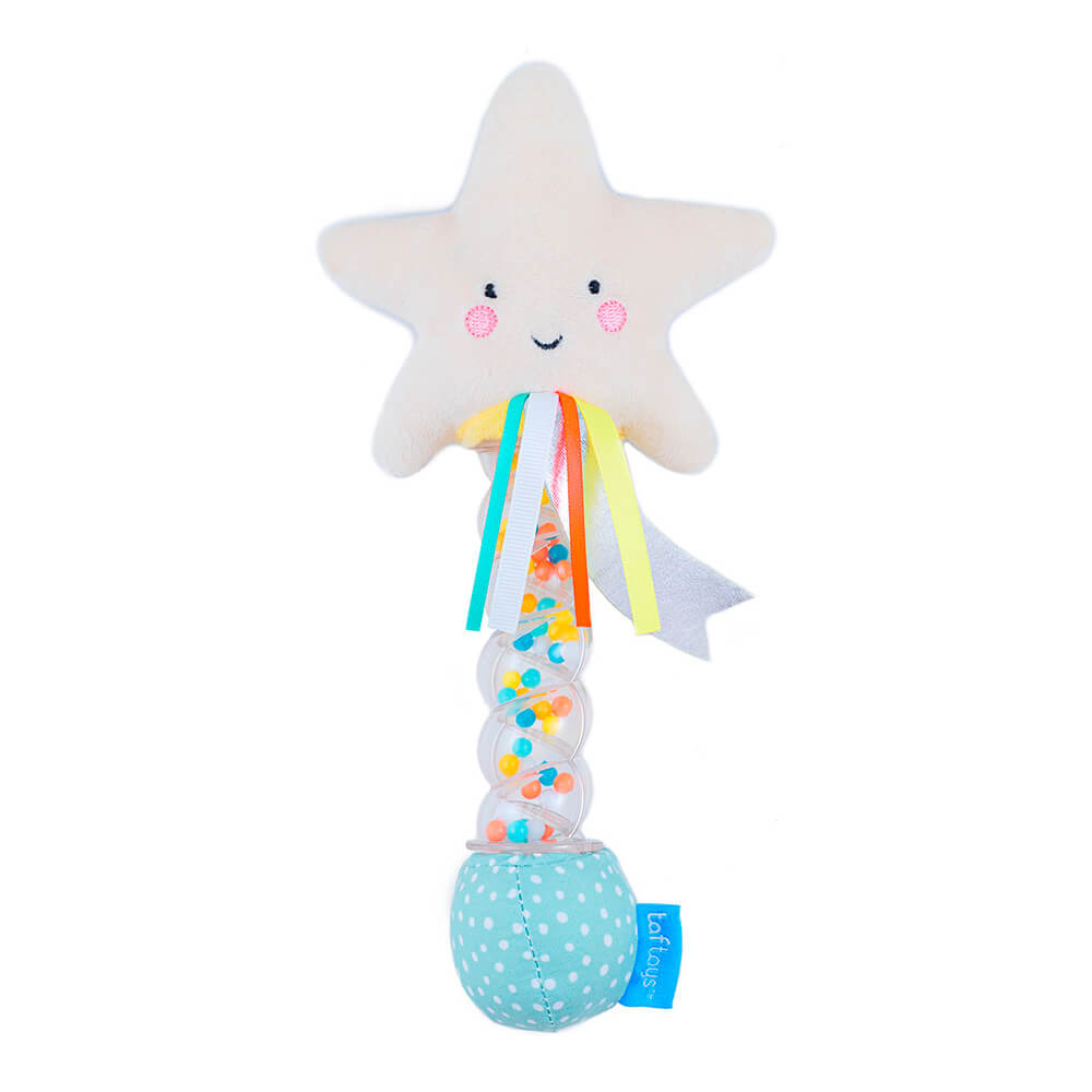 А еще на погремушке расположилась мягкая плюшевая звёздочка. Все элементы погремушки абсолютно безопасны, поэтому малыш может не только трясти игрушку, но и жевать. Погремушку удобно держать в детской ручке. Игрушки Taf Toys призваны обеспечить эмоциональное, умственное и физическое развитие малыша в течение первых двух лет его жизни.