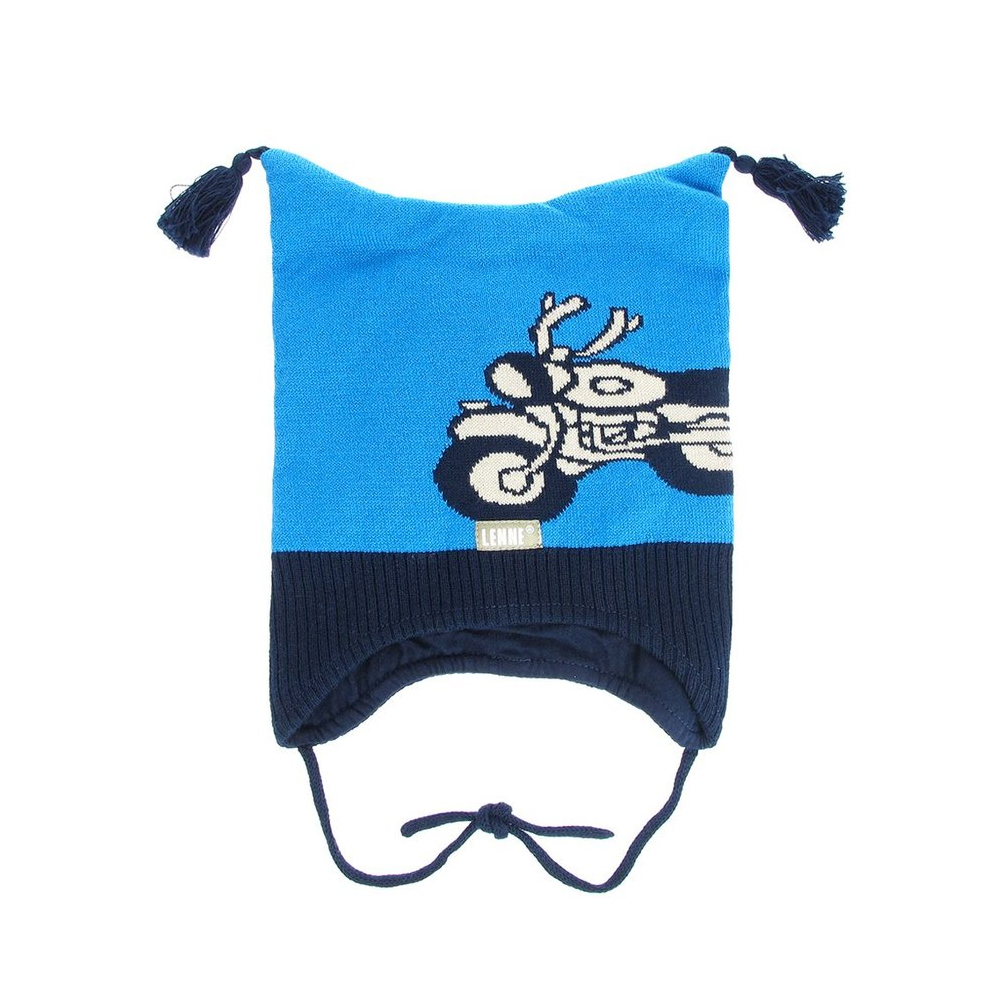 Трикотажная шапка с кистями для мальчика 3-4 лет. Рисунок – мотоцикл. Цвет - голубой с синим. Размер – 50.