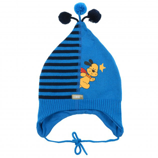 Трикотажная шапка с защитой ушей, на завязках для мальчика 3-4 лет. Рисунок – полоски. Украшена бубонами. Цвет - синий. Размер – 50.