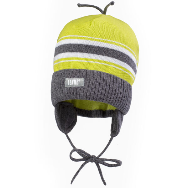 Трикотажная шапка с защитой ушей, на завязках для мальчика от рождения до 12 месяцев. Рисунок – полоски. Цвет - салатовый с серым. Размер – 46.