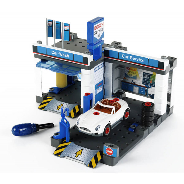 Детский набор для самостоятельной сборки состоит из автосервиса, мойки, спортивного автомобиля, запасного комплекта колес и отвертки. Все элементы достаточно велики, что позволит собрать игрушку даже трехлетнему малышу.