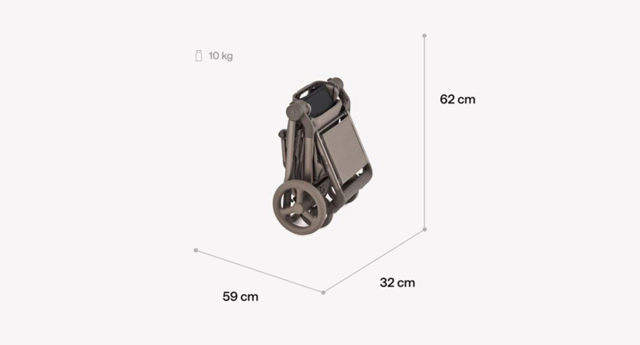 Рама складывается вместе с сиденьем в обоих направлениях. Сложенная коляска может стоять вертикально без опор, что позволяет оптимально использовать пространство. Для удобного переноса предусмотрена ручка.