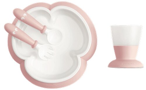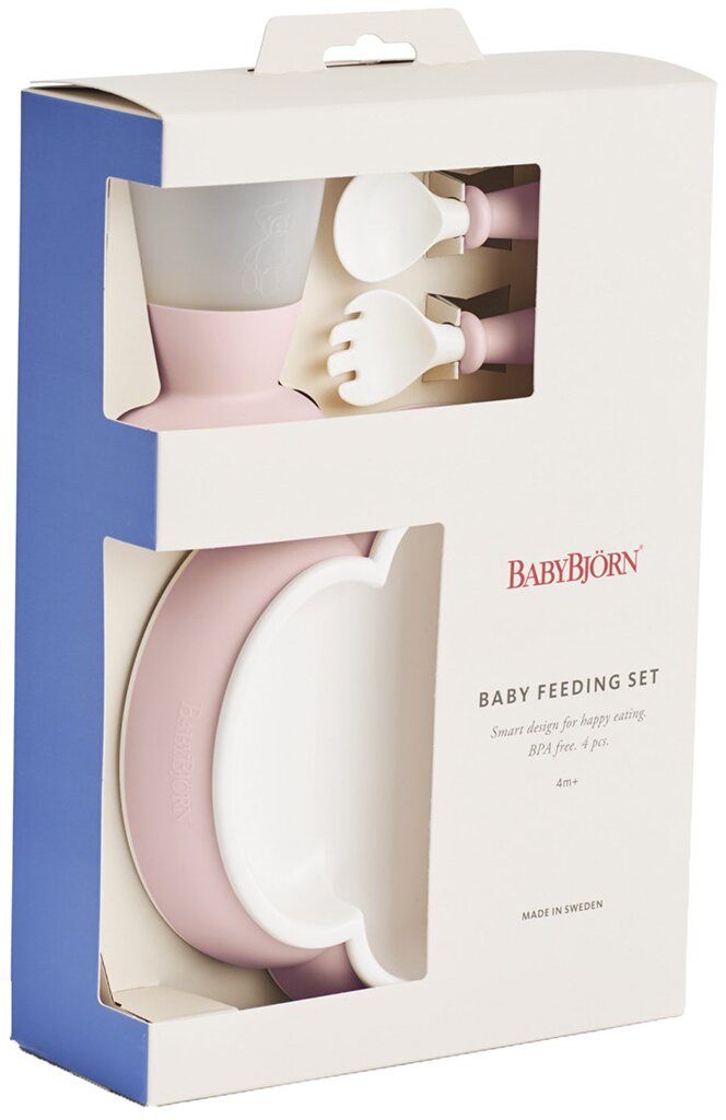 В набор входит: чашка, тарелочка, ложка и вилка. Чашка имеет мерные деления и специальную силиконовую подножку, которую трудно перевернуть со стола. Тарелка в форме трилистника разработана специалистами компании BabyBjorn, чтобы малыш легко зачерпывал пищу. Ложка и вилка разработаны в удобном для ребенка формате, их легко держать и с ними интересно есть. Набор изготовлен из пластика без ВРА. Чашка, ложка, вилка и край тарелки изготовлены из полипропилена и термопластичных эластомеров. Внутренняя пластина изготовлена из акрилонитрил-бутадиен-стирола.