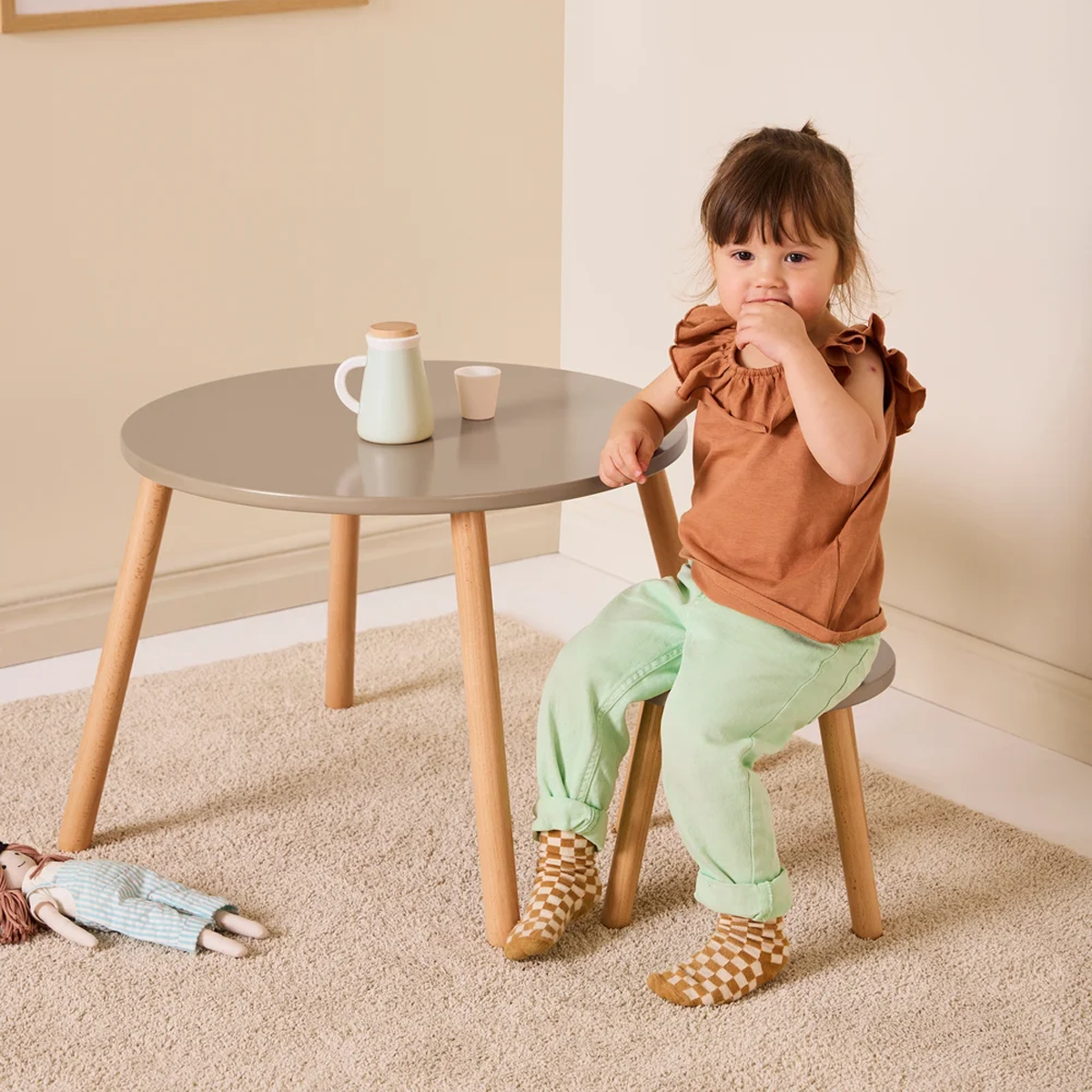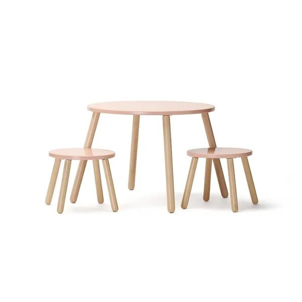 Детский набор мебели (стол + стул) Kids Concept обладает твёрдой, гладкой поверхностью, устойчивой к царапинам и лёгкой в уходе. Сиденье стула и столешница немного толще и имеют больший диаметр, чем у большинства аналогичных изделий. Благодаря наклонённым ножкам конструкция стола и стула устойчива и выдерживает активные детские игры. Материалы — бук (сертификат FSC) и MDF.