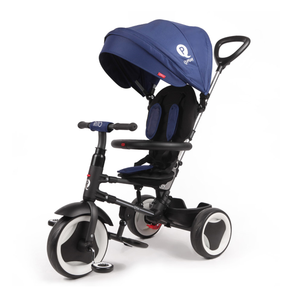 Трехколесный велосипед QPlay Rito можно толкать и контролировать взрослыми до тех пор, пока ребенок не научится ездить. В жаркий солнечный день капюшон защищает ребенка, и при необходимости его можно легко демонтировать.