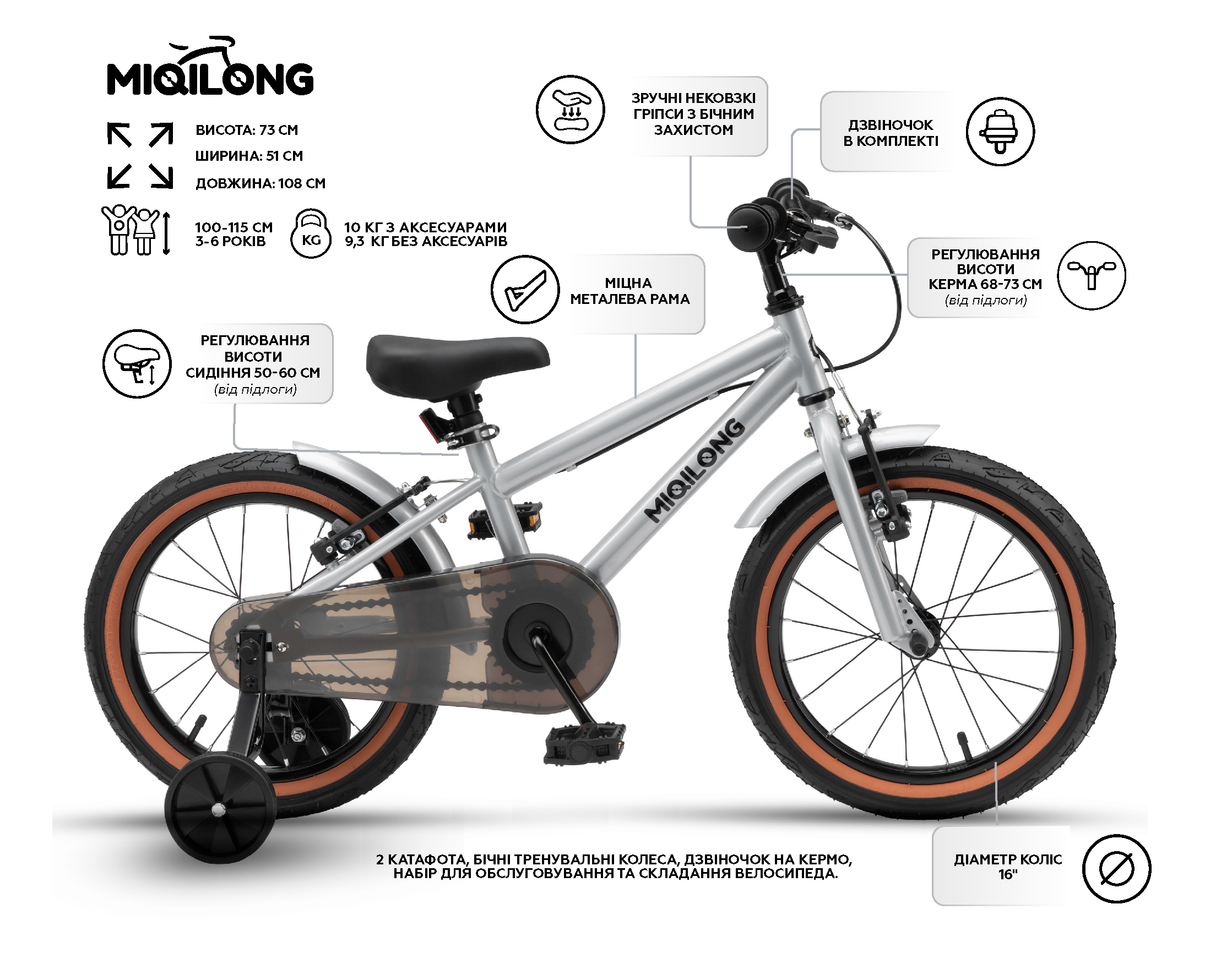 Детский велосипед Miqilong ST 16 дюймов - идеальный выбор для маленьких любителей катания. Благодаря своему изящному дизайну и прочной металлической раме он гарантирует комфорт и безопасность во время катания. Регулируемое сиденье и руль обеспечивают удобную посадку для детей разного роста. В комплекте вы найдете все необходимое для быстрой сборки и обслуживания. Выберите Miqilong для качественного и безопасного катания вашего ребенка. Рама велосипеда стальная и имеет достаточную прочность, чтобы выдержать все нагрузки связанные с обучением ребенка катанию на велосипеде. Выполнена по классической схеме городского велосипеда с высоким рулем. Такая конструкция обеспечивает удобную посадку и позволяет ребенку ездить на велосипеде с ровной осанкой, не выгибаясь и не горбясь. Руль и сиденье регулируются по высоте в широком диапазоне. Сиденье мягкое, с покрытием из ECO-кожи и дополнительными пружинами амортизации. Ручки руля мягкие, резиновые, с боковой защитой рук при падении.