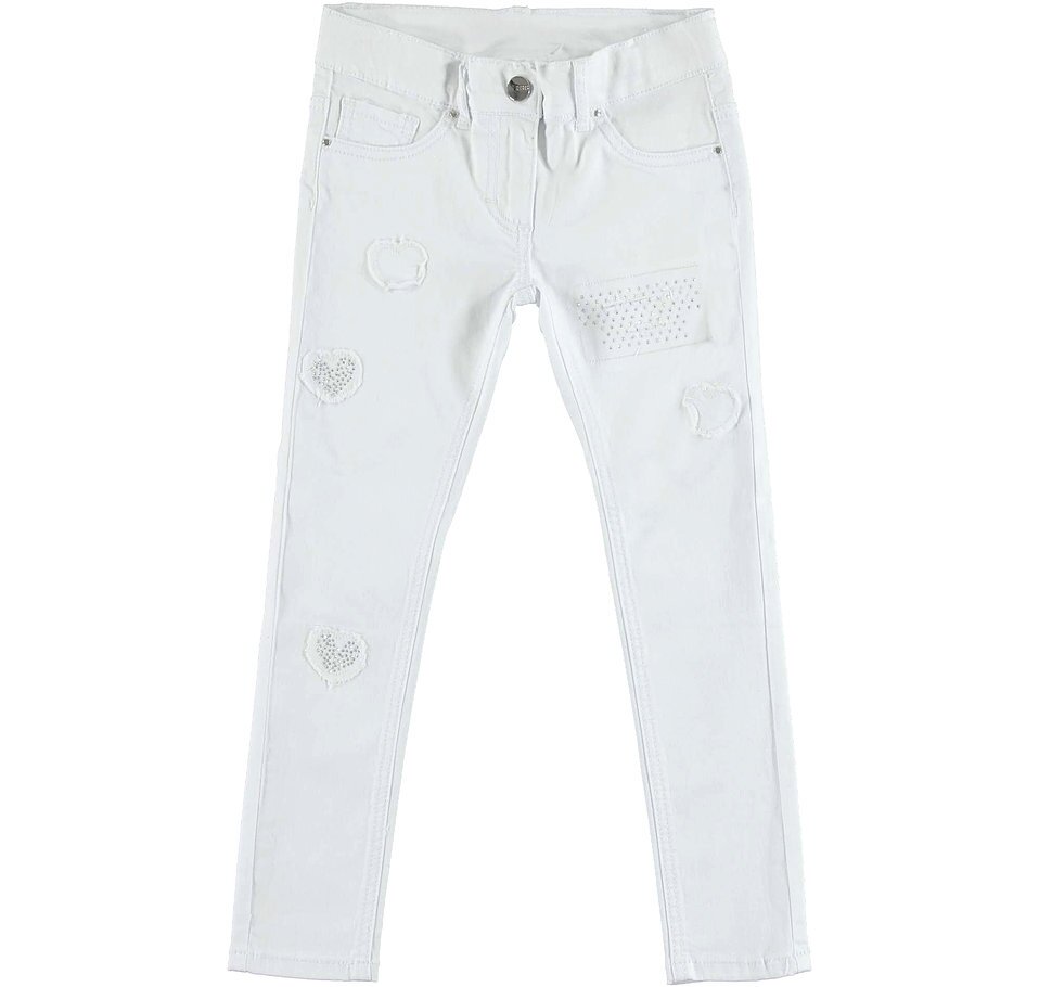 Белые джинсы с небольшими латками и блестящими сердечками не остануться без внимания маленькой модницы. Они имеют регулируемую резинку с петлей и внутренними пуговицами. Модель застегивается на молнию и пуговицу, имеет передние и задние карманы. Состав ткани: 98% хлопок, 2% эластан. Детская одежда бренда iDO - это высокое европейское качество и лучшие модные тренды!