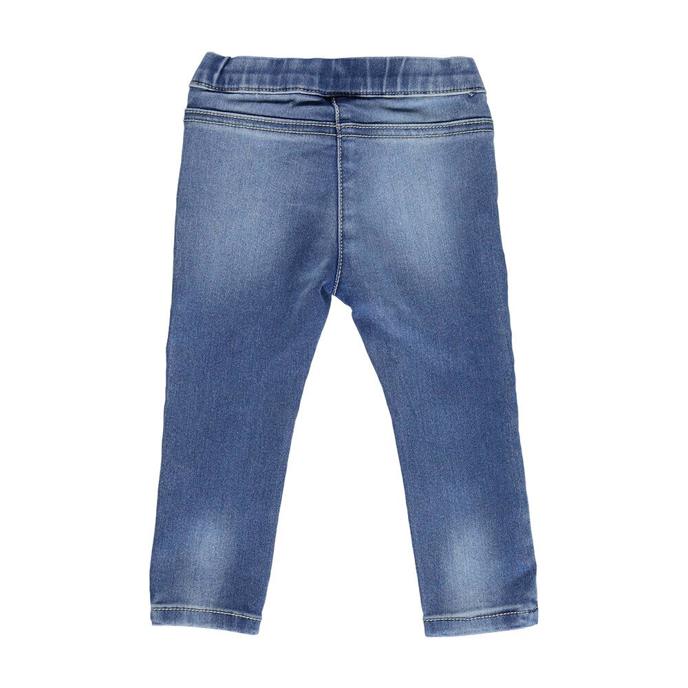 Удобные и модные джинсы без застежки для маленькой модницы. Объем по талии регулируется эластичным поясом. Есть имитация передних карманов, легкие потертости и царапины, аппликация-эмблема из страз. Состав 78% хлопок, 21% полиэстер, 1% эластан.