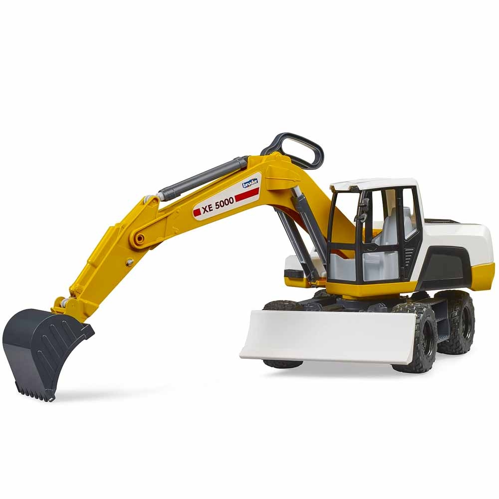 Колесный экскаватор Bruder XЕ 5000 (03413) является уменьшенной до масштаба 1:16 копией реальной техники. Экскаватор обладает реалистичным и ярким дизайном, интересным функционалом и прост в управлении. Центральная рукоятка может поднимать и опускать всю стрелу экскаватора и перемещать ковш. Корпус экскаватора можно поворачивать на 360°, а большой ковш регулируется по высоте. В панорамную кабину можно усадить человечка из серии bWorld в качестве водителя. У экскаватора плавное движение благодаря большим колесам с мягкими резиновыми покрышками и протектору.
