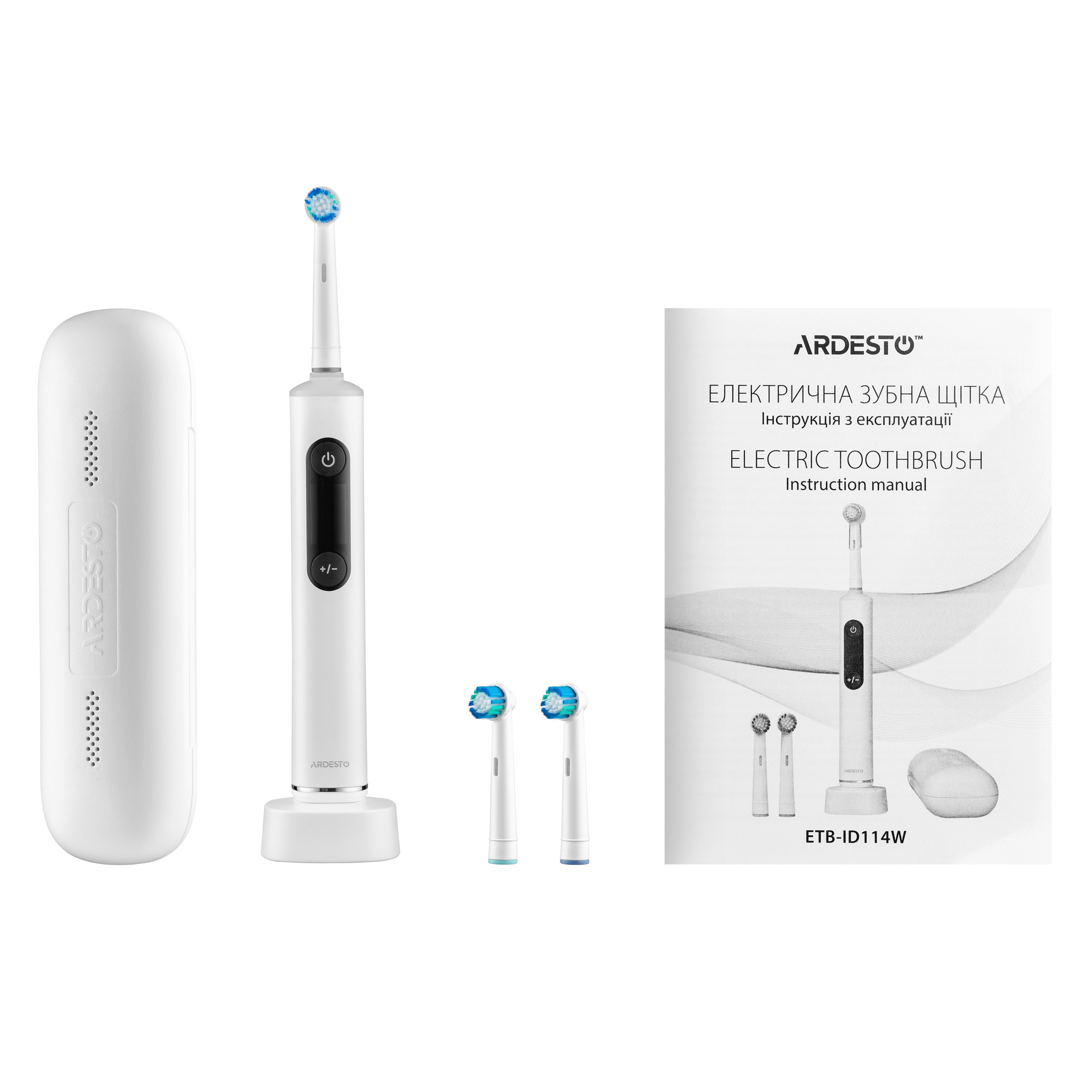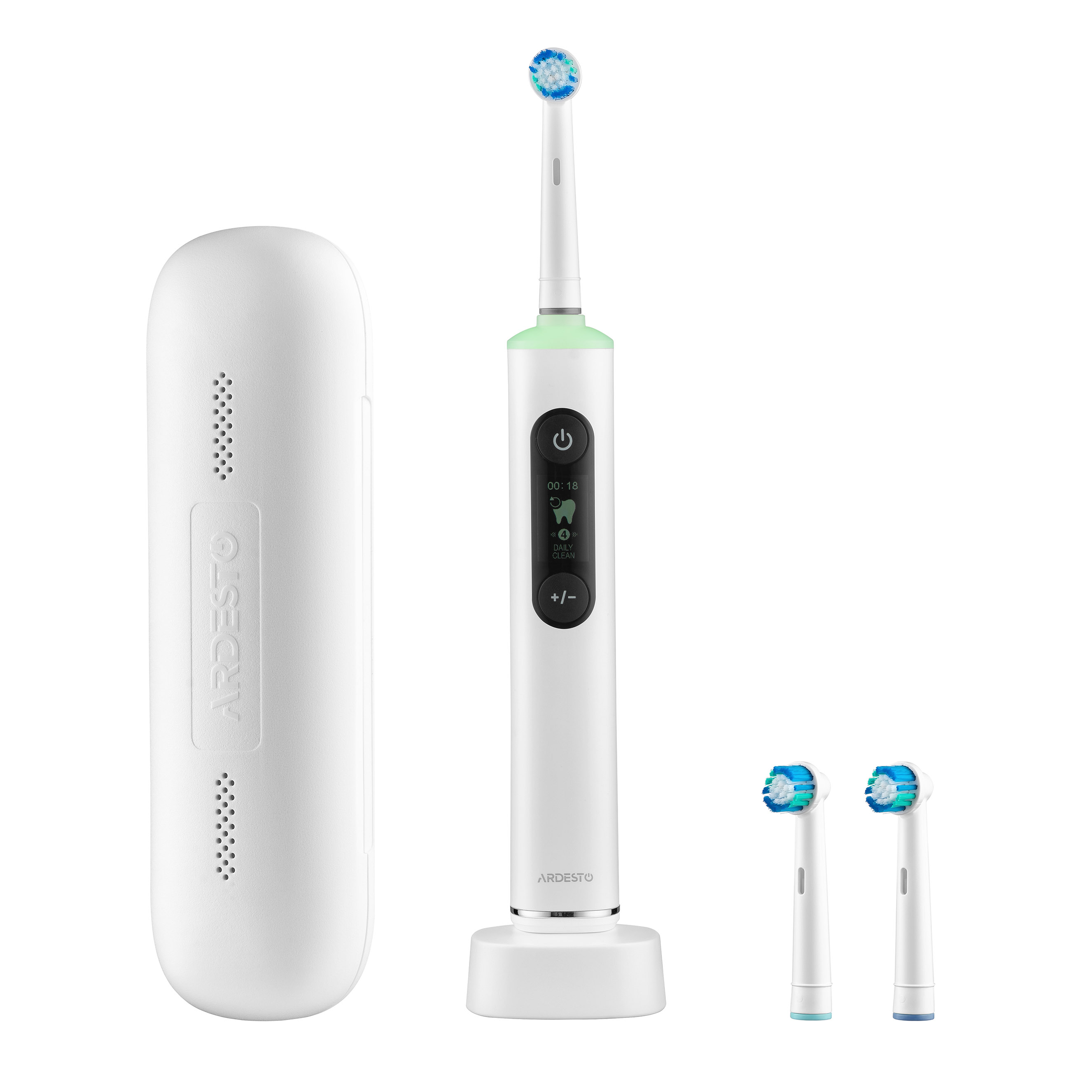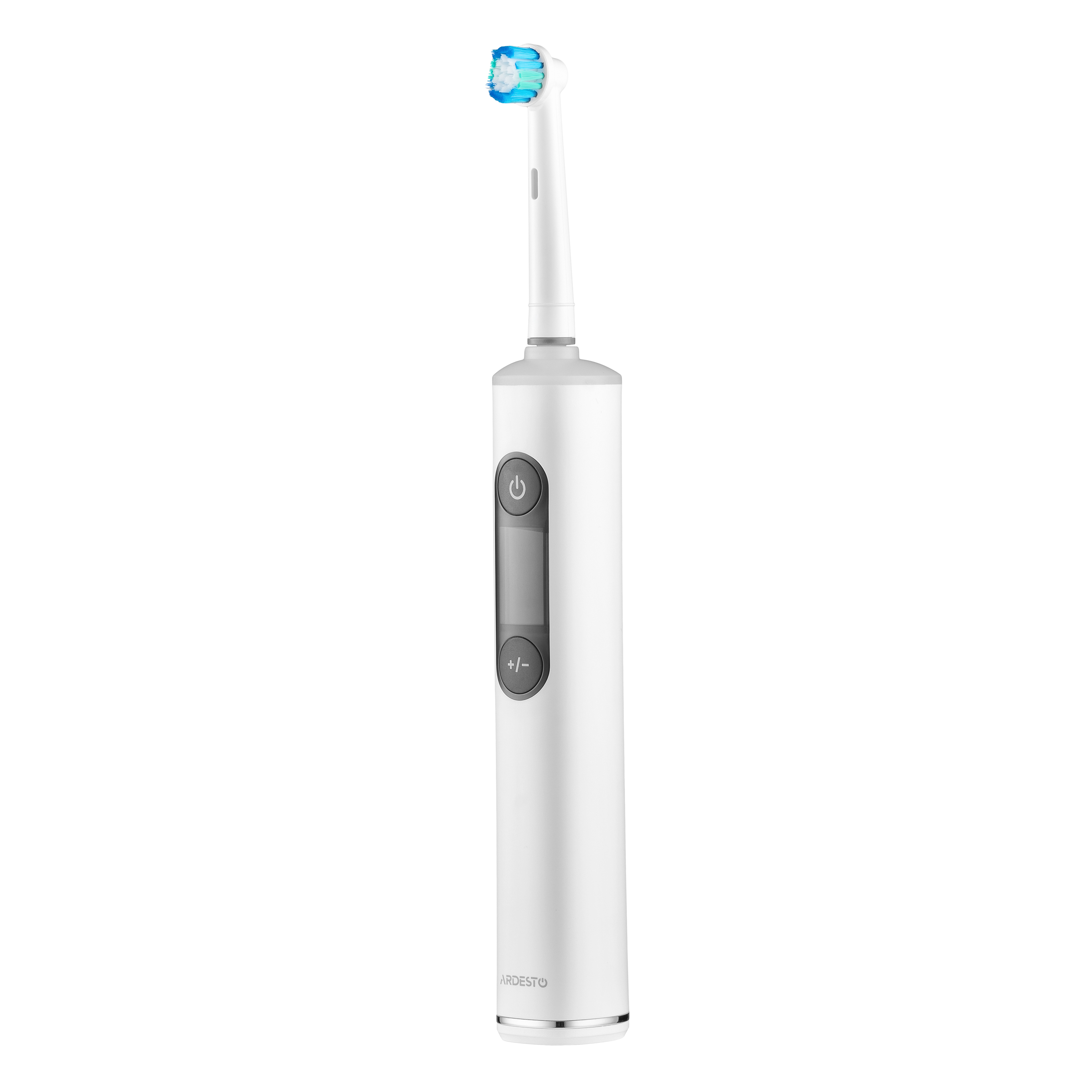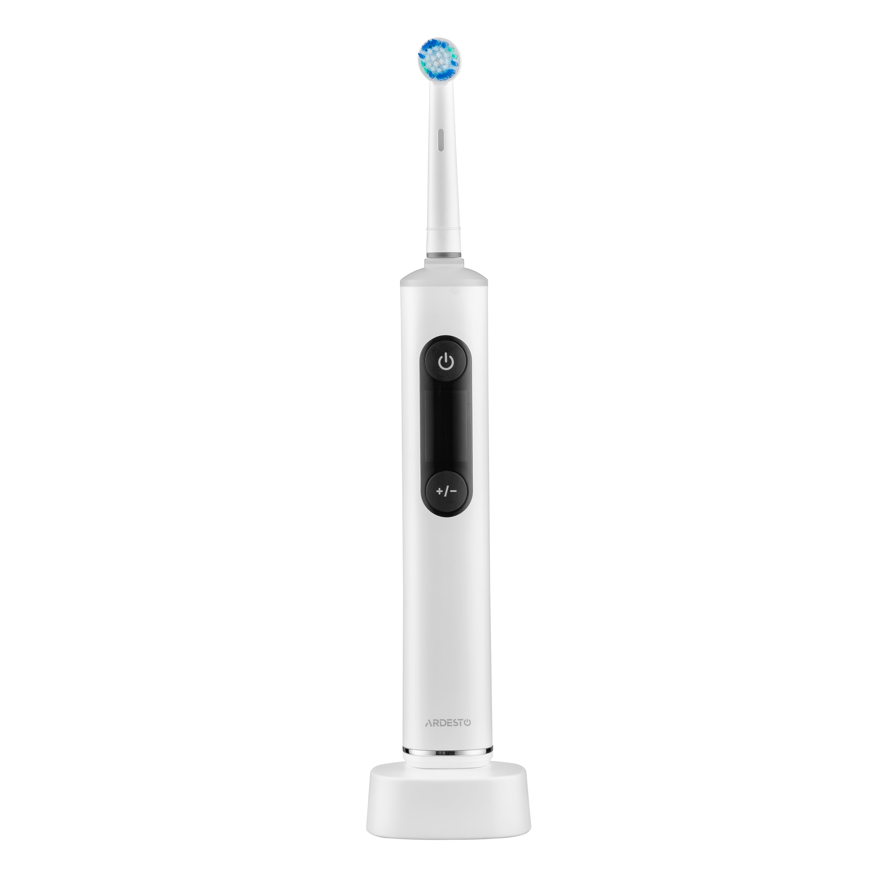 Электрическая зубная щетка ARDESTO работает на скорости от 6800 до 10000 об./мин и поддерживает пять режимов чистки с пятью уровнями интенсивности. Щетинки DuPont и Pedex средней жесткости эффективно удаляют налет, а их обесцвечивание служит индикатором износа насадки. Модель оснащена LCD-дисплеем, смарт-таймером, функцией памяти, сенсором избыточного нажатия и цветовой световой индикацией. Аккумулятор ёмкостью 800 мА·ч обеспечивает до 90 минут автономной работы, что эквивалентно более чем трём неделям использования (по 2 минуты дважды в день). Зарядка осуществляется беспроводным способом. В комплекте: три насадки, индуктивная зарядная база с USB-кабелем, защитный колпачок и дорожный футляр.