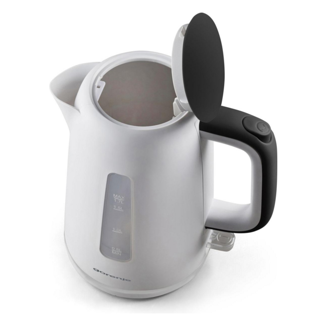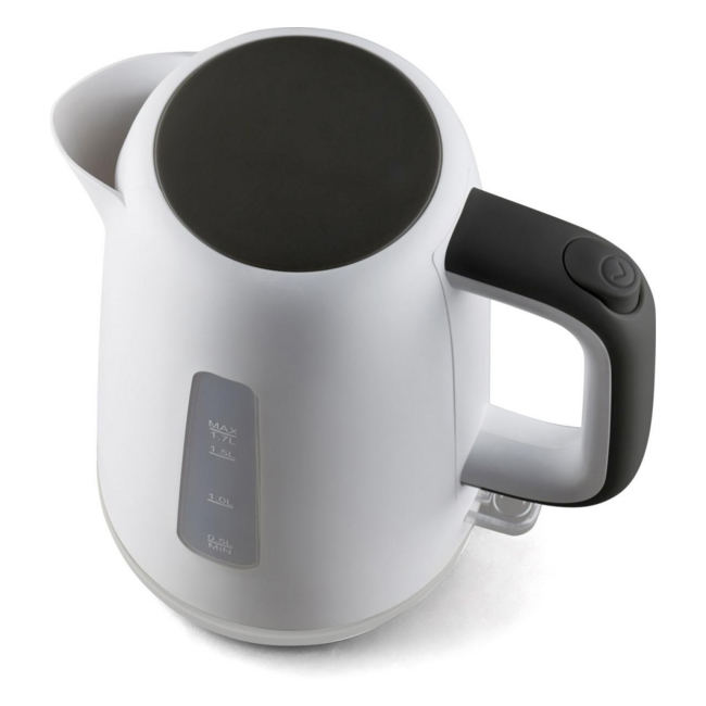 Корпус выполнен из прочного пластика, который не нагревается снаружи, что делает использование чайника комфортным и безопасным. Удобная шкала уровня воды и кнопка открытия крышки спрощают повседневное использование.