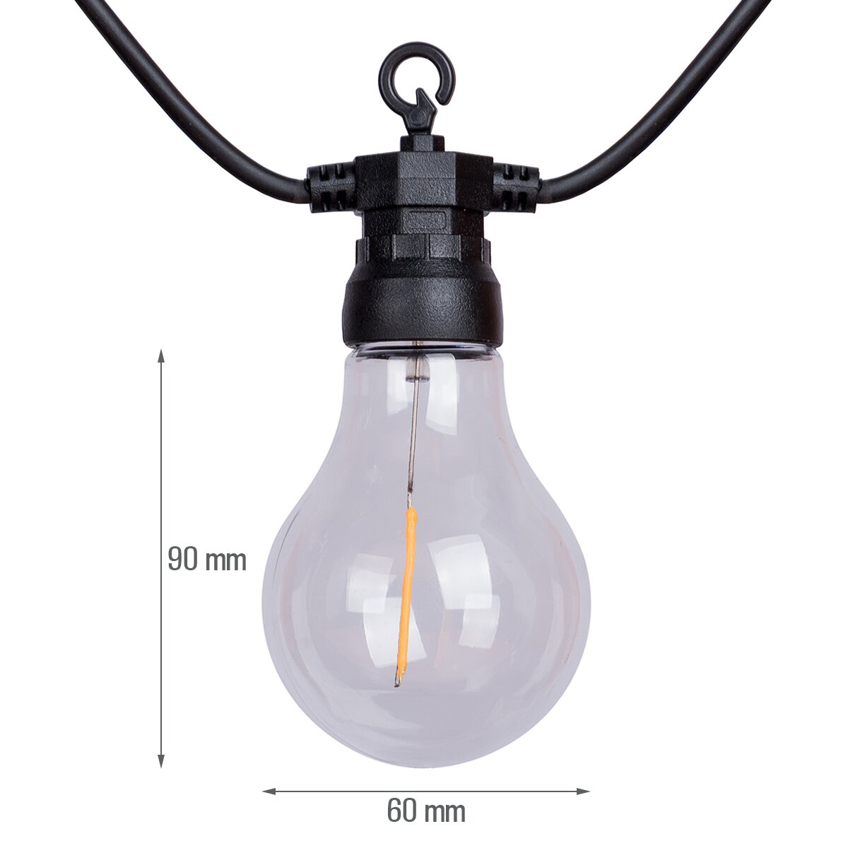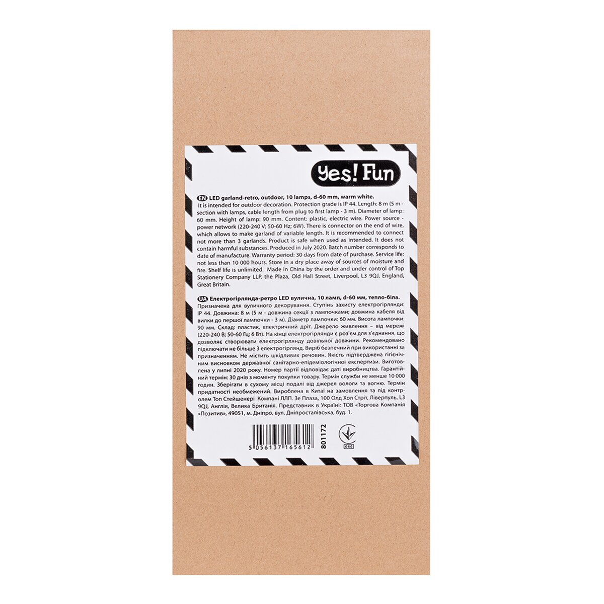 Электрогирлянда-ретро используется для интерьерного и уличного декорирования. Цвет светящихся лампочек: тепло-белый; диаметр - 60 мм; высота — 90 мм. Количество лампочек: 10 шт.. Степень защиты электрогирлянды IP 44. Длина провода: 8 м (5 м — секция с лампочками, 3 м — длина кабеля). Состав: пластик, электрический провод. Источник питания: от сети (220-240 В, 50-60 Гц, 6 Вт). В конце электрогирлянды есть разъем для соединения, который позволяет создавать электрогирлянду произвольной длины.