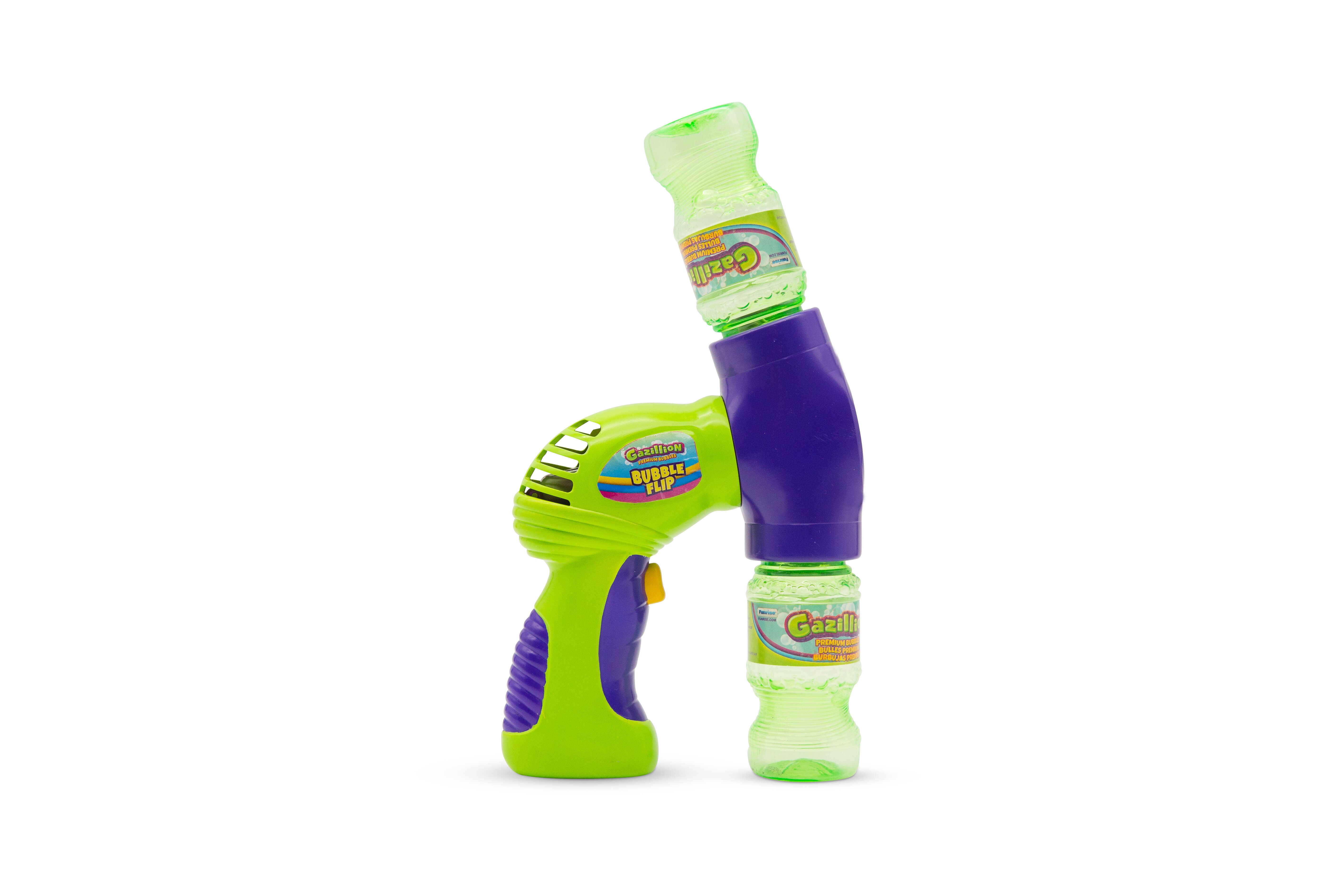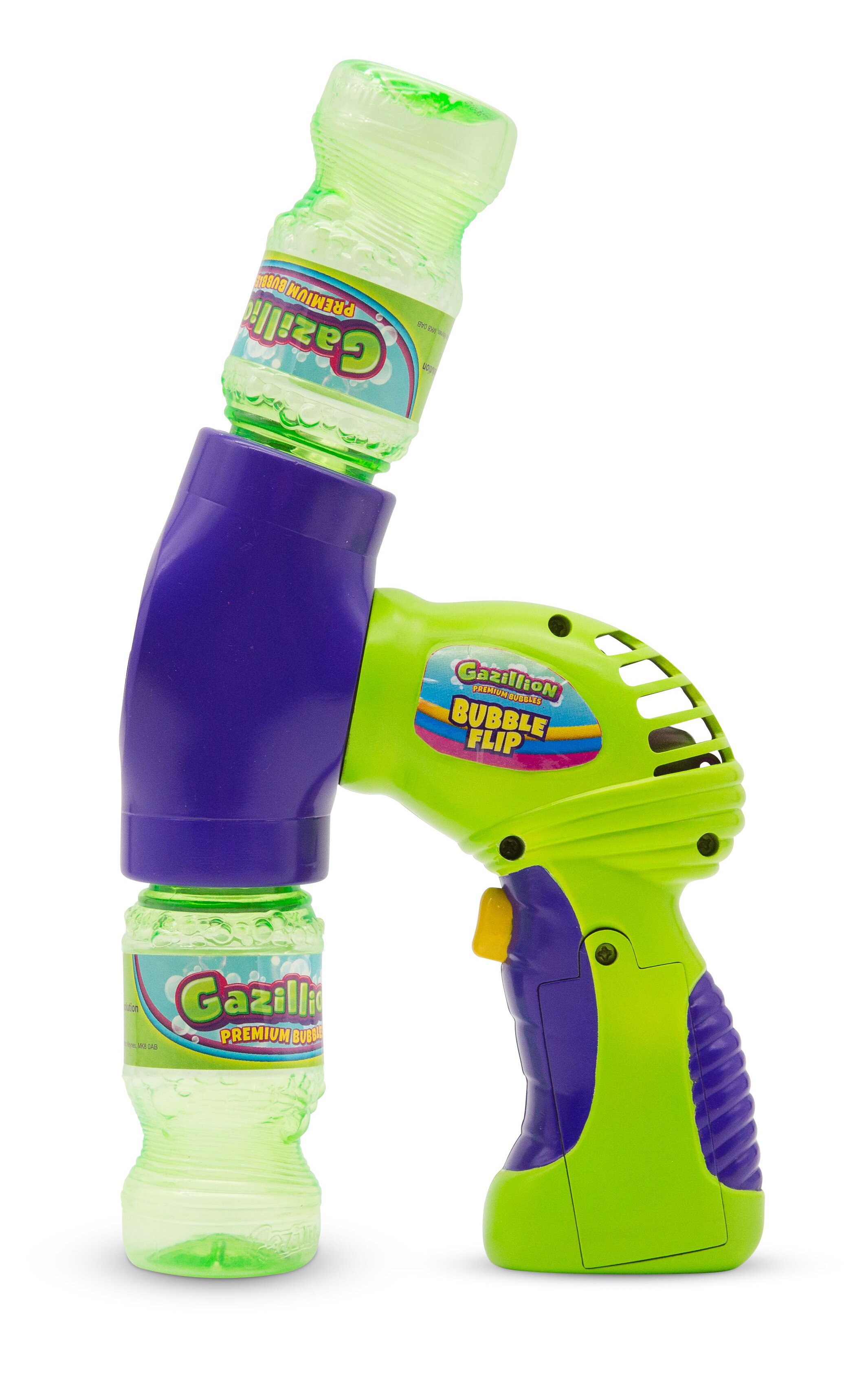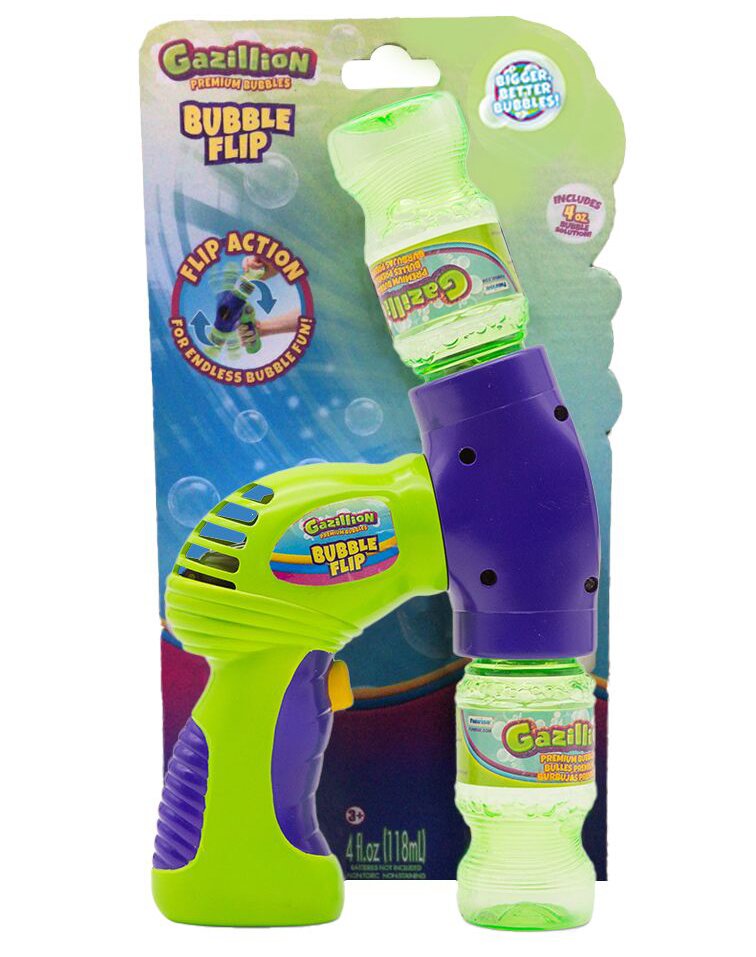 Представляем Gazillion Bubbles® Bubble Flip для непрерывного потока пузырьков! Благодаря дизайну флип-экшн веселье пузырей никогда не заканчивается! Вставьте бутылку с раствором в пузырчатый бластер, после полного нажатия на спусковой крючок начнется выдувание потока пузырьков. Когда бутылка опустеет, переверните переднюю часть бластера, используйте бутылку как ручку и снова нажмите на спусковой крючок, чтобы усилить действие пузырей!